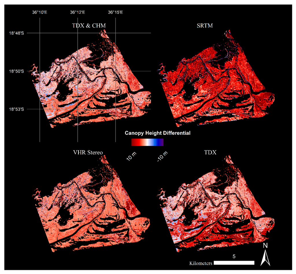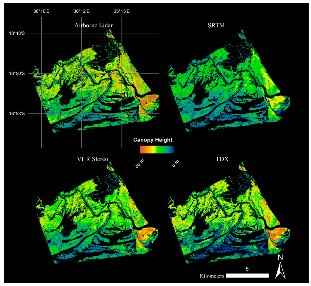 When making comparisons between CHMs the reference elevation plane and the elevation of the measured physical parameter within the mangrove canopy also need to be considered. Because of the presumptuously flat terrain, we remove the underlying topography though differences between the geoid, ground and water level elevations, which could influence height variability between CHMs. The remote sensing approaches used in this study have variable elevation reference frames, which are a function of the data preprocessing and sensor sensitivities. Mangrove canopy height estimates generated from airborne lidar and SRTM were referenced to geoid models, while the TDX and VHR heights were fixed to physical references such as water level and the ground surface, respectively, after initial corrections to the geiod [13,14,16]. Small changes in frame of reference elevation may account for some of the differences reported in this study and actual canopy heights measured and reported across the Zambezi Delta [13].