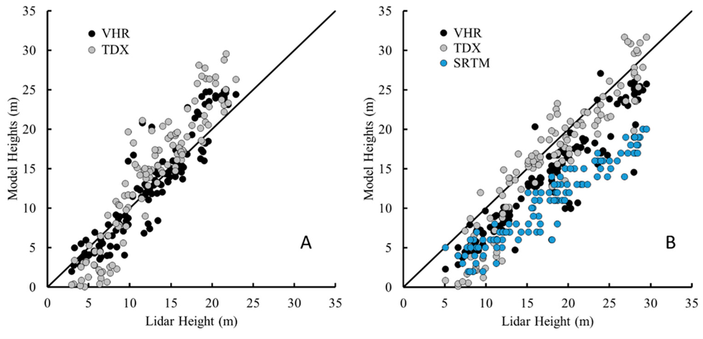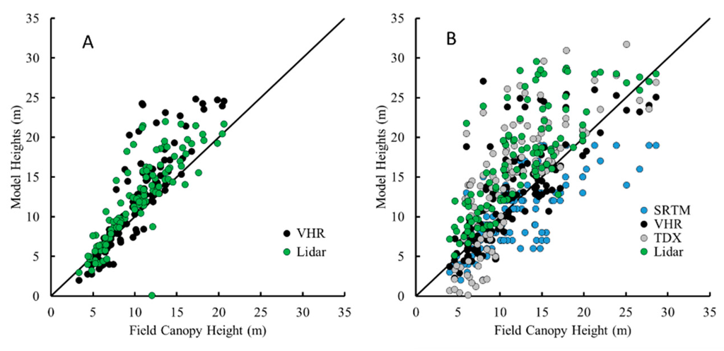 The results of the present study show a strong correlation between each of the datasets as seen in similar mangrove environments in the Caribbean [11,13] and Africa [14,16] as well as other deciduous and pine forest types [21,22,43]. The differences among CHMs can be related to the differences in ground reference frames (i.e., field surveys and airborne lidar), spatial resolution, temporal resolution, time lag in acquisitions and senor sensitivities. Two ground reference frames, field surveys and airborne lidar, were used in this study to represent the ground-truthed canopy height. By comparing other independent remotely sensed CHMs (i.e., SRTM, VHR, and TDX) with the field-measured and airborne lidar canopy heights we can discern the capabilities and height bias for each method.