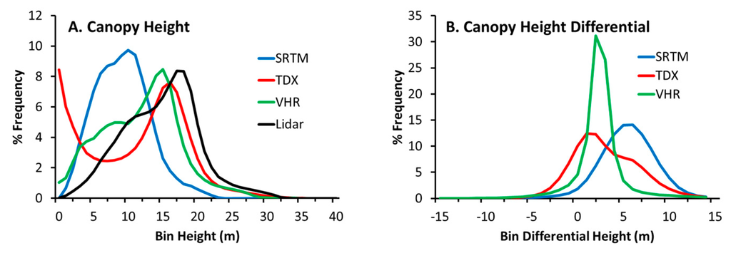Differential canopy heights, with respect to lidar, were also determined for satellite-derived CHMs. The TDX CHM has the lowest maximum frequency height differential at 1–2 m, followed by VHR CHM with 3 m, and finally SRTM with 6 m (Figure 5B). The mean difference between the lidar reference and satellite-derived CHMs for all mangrove pixels were 2.99, 3.58, and 6.06 m for VHR, TDX, and SRTM, respectively.