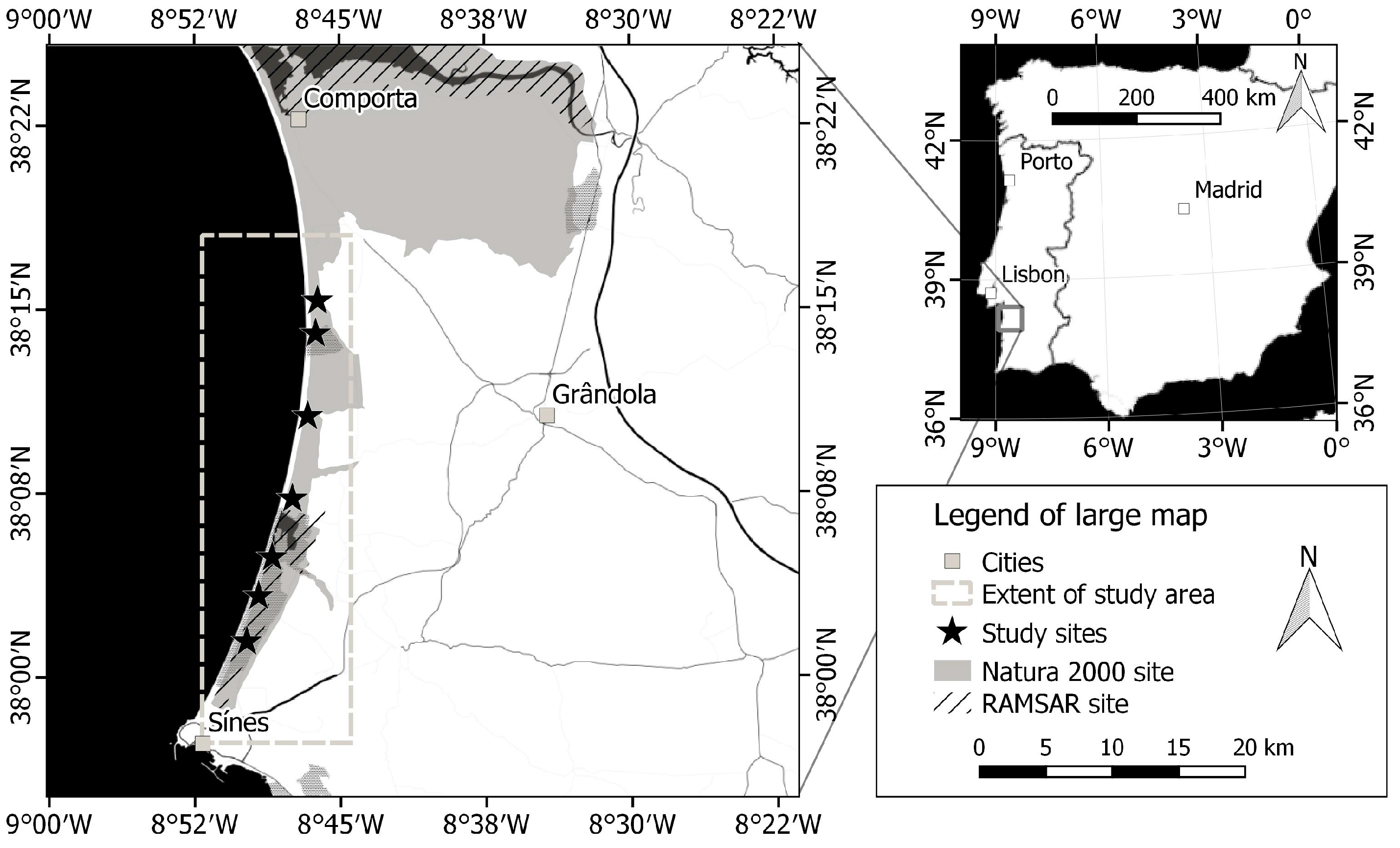 - Instituto da Conservação da Natureza e da Biodiversidade. Sítio Comporta/Galé; Plano Sectorial da Rede Natura 2000; Instituto da Conservação da Natureza e da Biodiversidade: Lisbon, Portugal, 2005. [Google Scholar]