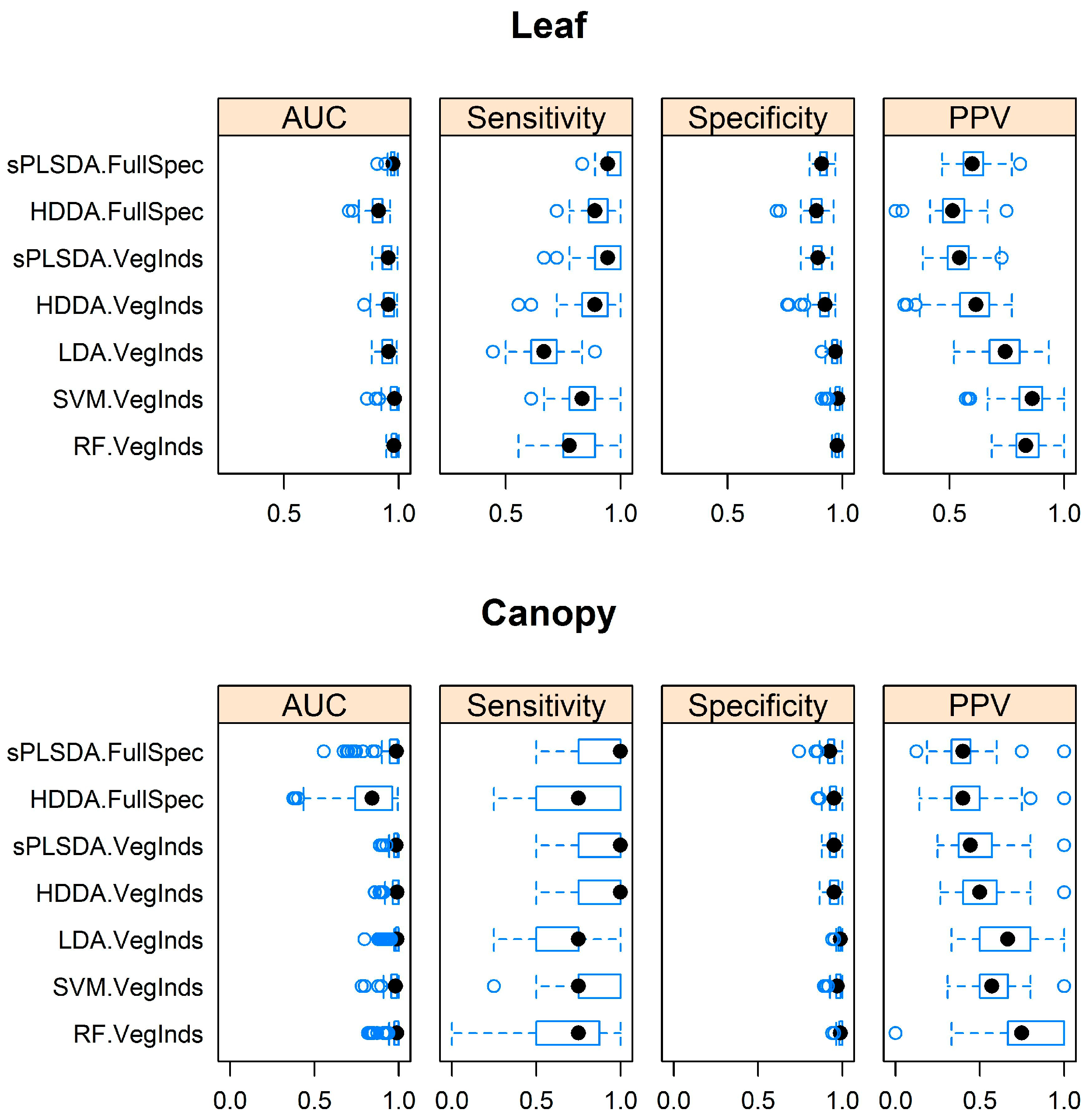 At the canopy level, the values for Sensitivity had a low resolution and alternated between 0.75 and 1 due to the sample size. The best results regarding Sensitivity were achieved by sPLSDAFullSpec, sPLSDAVegInds and HDDAVegInds. The latter reached higher AUC and Specificity, and therefore a higher PPV, but the PPV was relatively low compared to all other classifiers using index data. Thus, despite the high Sensitivity, the amount of identified individuals of the target species, A. longifolia, was overestimated. On the contrary, LDAVegInds, SVMVegInds and RFVegInds had moderate Sensitivity, but a higher PPV. RFVegInds had the highest PPV of all classifiers, though it showed some extreme outliers.