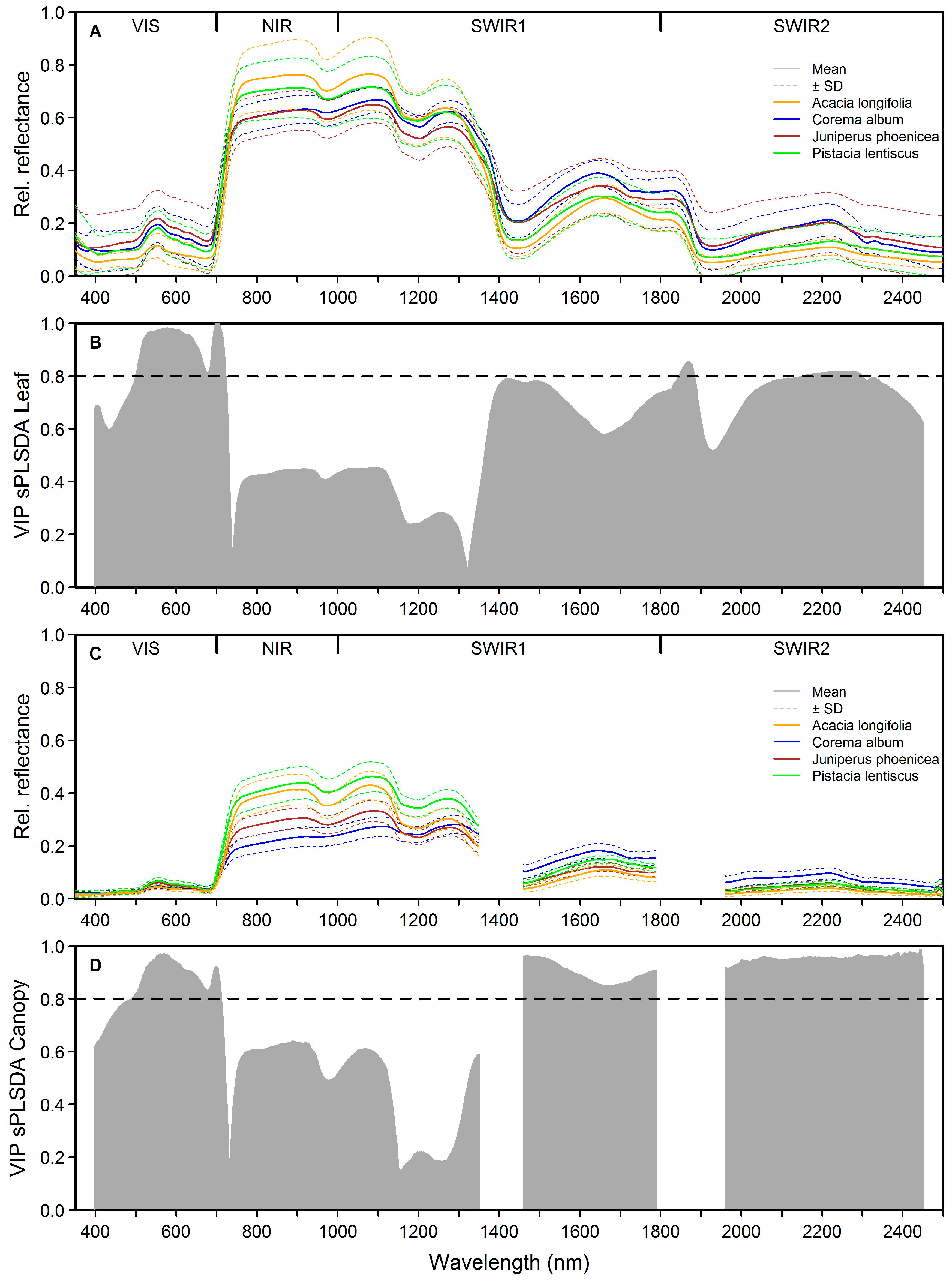 Field spectra and medians of Variable Importance (VIP) (100 iterations) of classification models of Acacia longifolia: (A) mean leaf spectra of A. longifolia and co-occurring native species; (B) VIP of sparse Partial Least Squares Discriminant Analysis (sPLSDA) using the full spectrum at leaf level; (C) mean canopy spectra of A. longifolia and co-occurring native species; and (D) VIP of sparse Partial Least Squares Discriminant Analysis (sPLSDA) using the full spectrum at canopy level. VIP values > 0.8 (dashed lines) indicate highly important predictors.