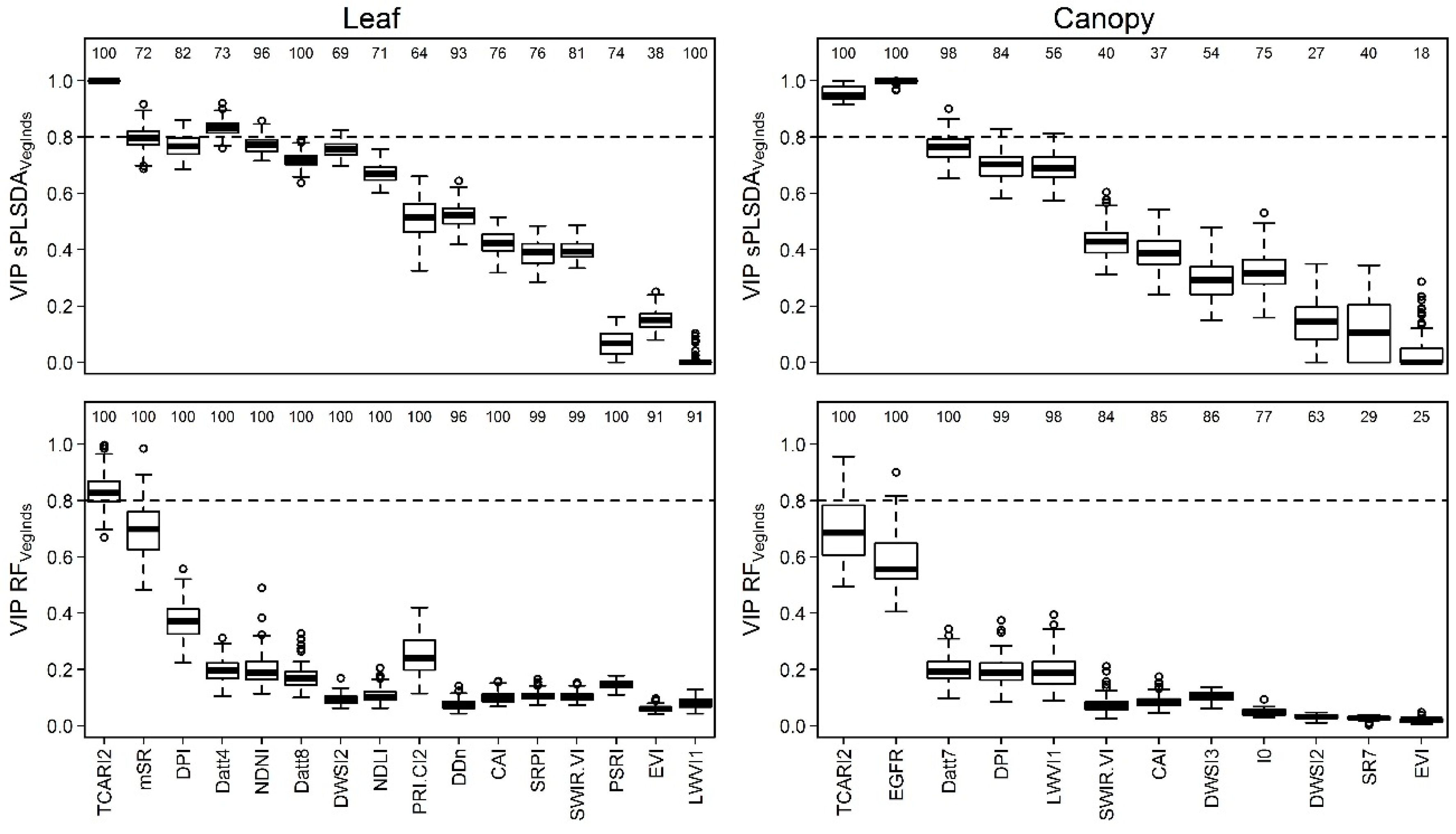 Distribution of Variable Importance (VIP) values of vegetation indices from 100 iterations of classification models of Acacia longifolia using field spectra of leaves and canopies. VIP values higher than 0.8 (dashed lines) indicate highly important predictors. For explanations of vegetation indices, see Table 3. Numbers above boxes show the frequency with which the respective index was selected in the final model (max = 100). Boxplots: show medians, interquartile ranges and extreme values within 1.5 × interquartile range.