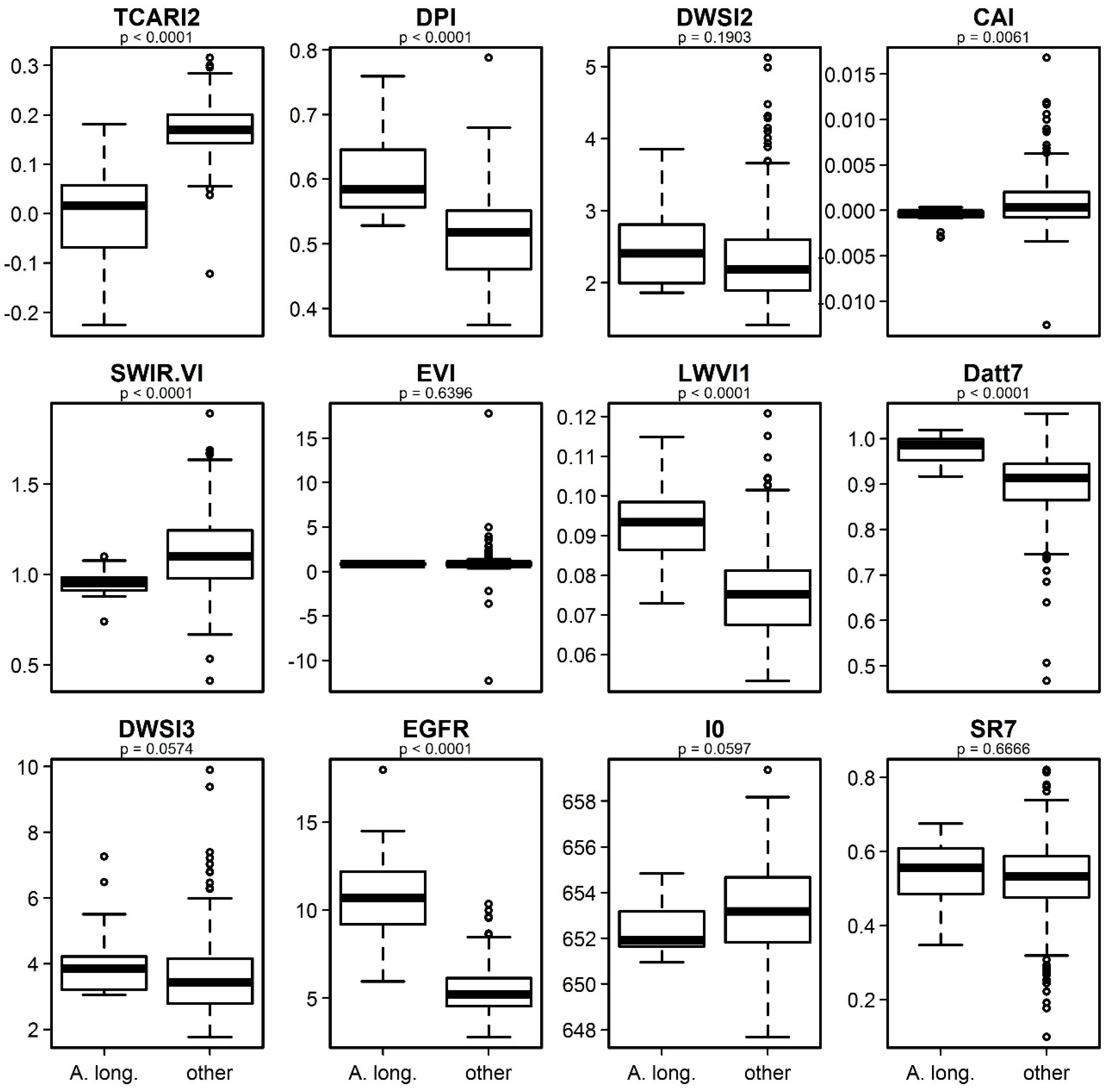 Boxplots of the vegetation indices used at canopy level to distinguish Acacia longifolia (“A. long.”) from other exotic and native dune species (“other”). p-values from U-Test testing for differences between the two groups are given.