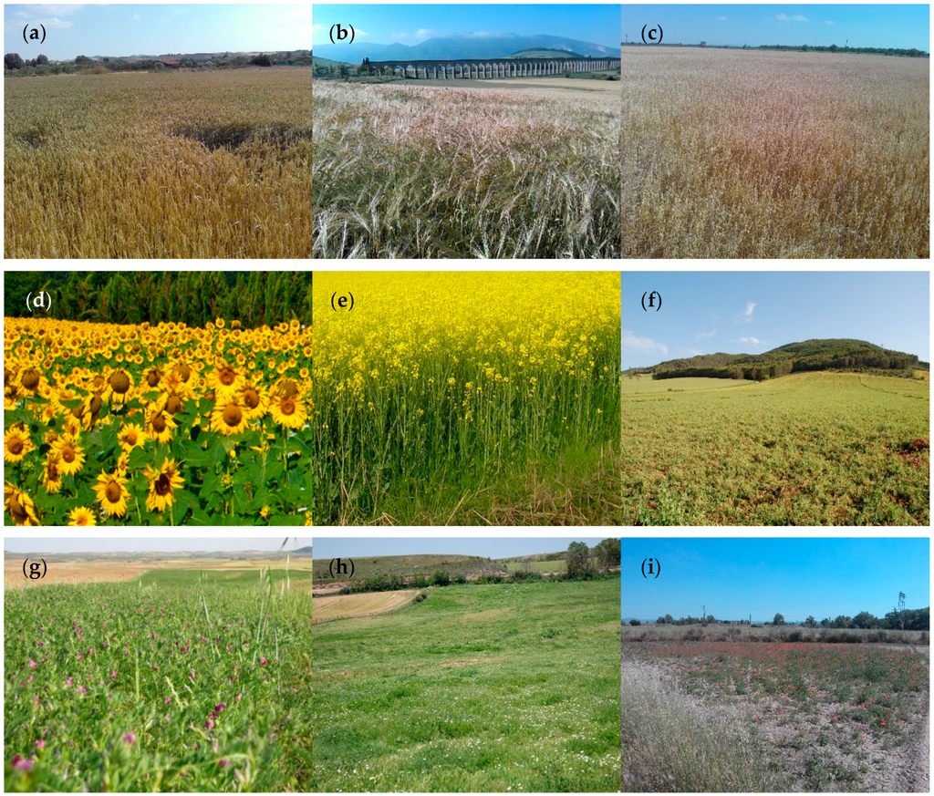 Photographs of the different crops studied: (a) wheat; (b) barley; (c) oats; (d) sunflower; (e) rapeseed; (f) peas; (g) vetch; (h) grasslands; and (i) fallow.
