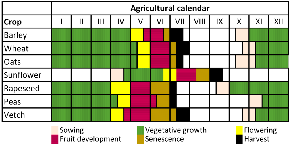 Agricultural calendar of the crops cultivated in the area. Sowing and harvest dates are shown, as well as main phenological stages (their duration is approximate).
