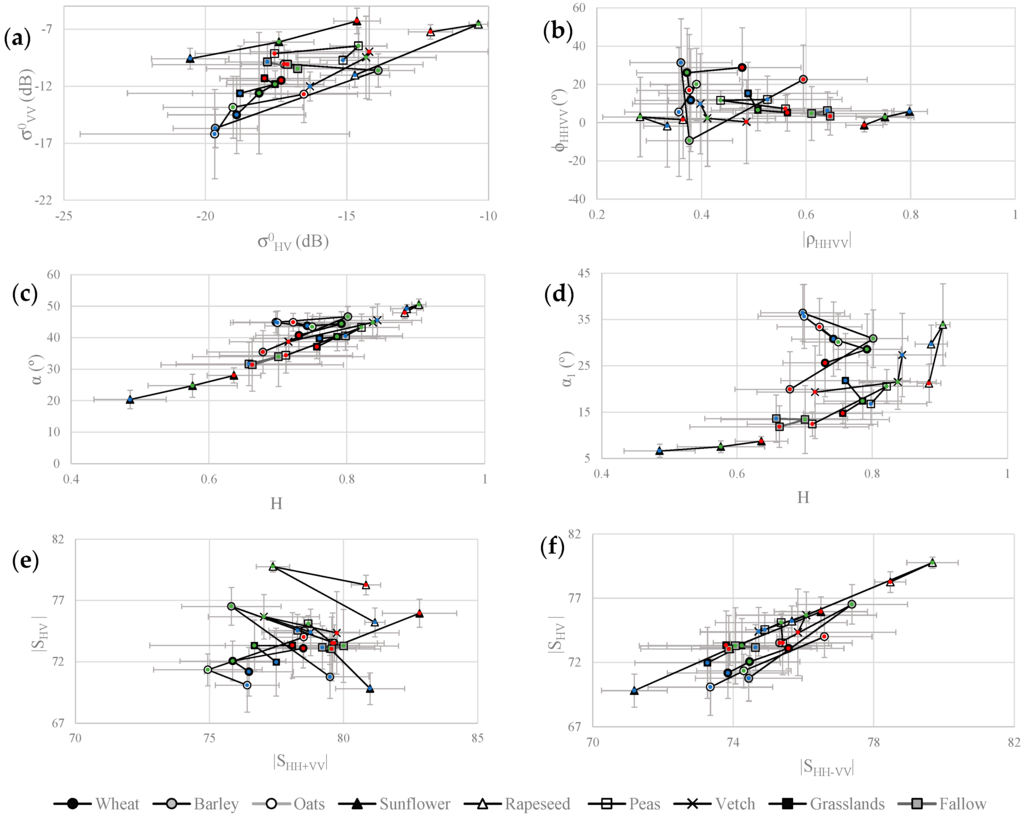 Different scatterplots for the three studied dates: (a) σ°HV vs. σ°VV; (b) |ρHHVV| vs. φHHVV; (c) H vs. α; (d) H vs. α1; (e) |SHH+VV| vs. |SHV|; (f) |SHH-VV| vs. |SHV|. Colors represent different dates, blue = 12 May 2010, green = 5 June 2010 and red = 19 June 2010. Points represent class means and error bars ±1 standard deviation.