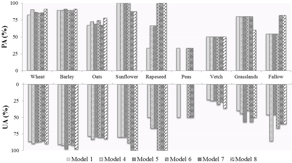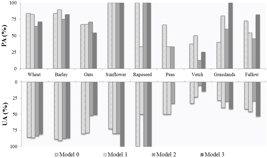 Figure 6 shows the accuracy obtained for individual crop classes on each model (0 to 3) representing the producer’s and user’s accuracy (%). PA represents the probability that a certain crop class on the ground is correctly classified, whereas UA refers to the probability that any field classified as a certain crop class in the image is actually this class on the ground. PA corresponds to errors of omission (fields of a certain class not classified as such) and UA to errors of commission (fields included erroneously in a certain class).