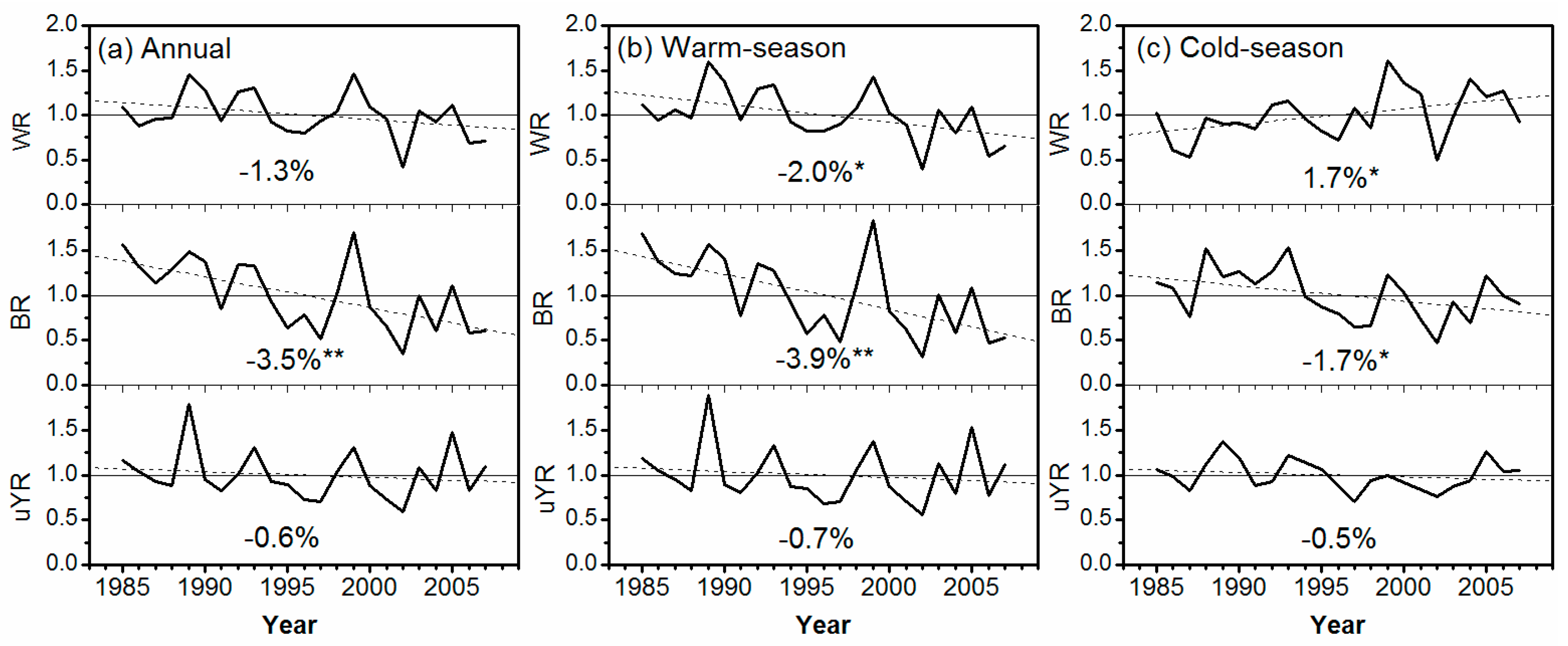 The normalized annual (a); warm season (from May to September) (b); and cold season (from October to April) (c) discharges of the WR, BR and uYR basins from 1985 to 2007. The dot dash lines indicate the regression lines of the discharge series. The numbers at panel bottom are the linear-regression slopes for the normalized discharges, while ** and * denote the significance levels p < 0.01 and p < 0.05, respectively.