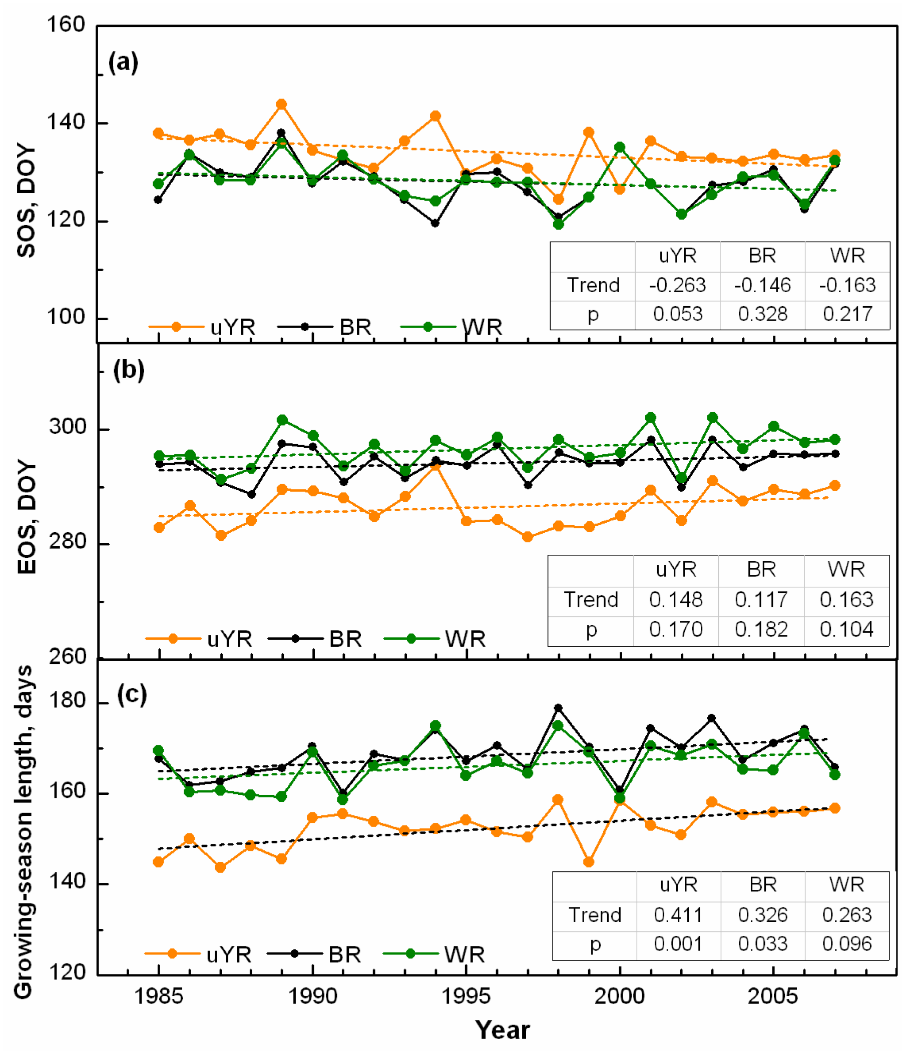 The trends in three phenological metrics derived from the GIMMS3g NDVI dataset during the period from 1985 to 2007 in the TP study areas, including, (a) start of growing-season (SOS, in day of year, DOY); (b) end of growing-season (EOS, in DOY) and (c) annual growing-season length (in days).