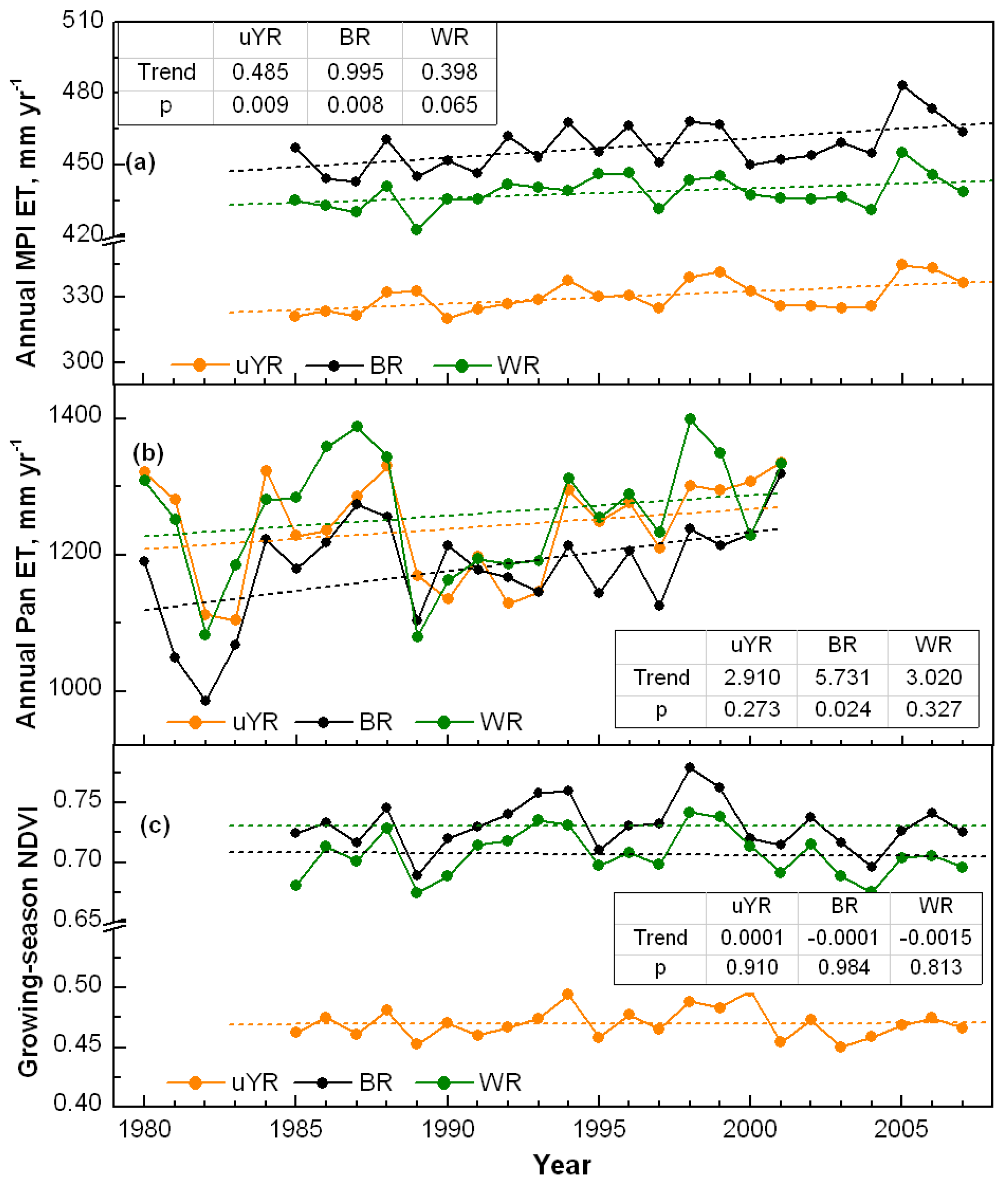The annual ET (a,b) and growing-season Normalized Difference Vegetation Index (NDVI) (c) in the BR, WR and uYR basins. (a) MPI ET was derived from a global ET dataset upscaled from FLUXNET tower observations [], while the reference ET (b) was obtained from pan evaporation measurements within the study domain. The NDVI record was derived from the GIMMS3g dataset. The trends were calculated for different periods (i.e., 1985–2007 in panels (a) and (c), and 1980–2001 in panel (b)) due to data availability constraints.