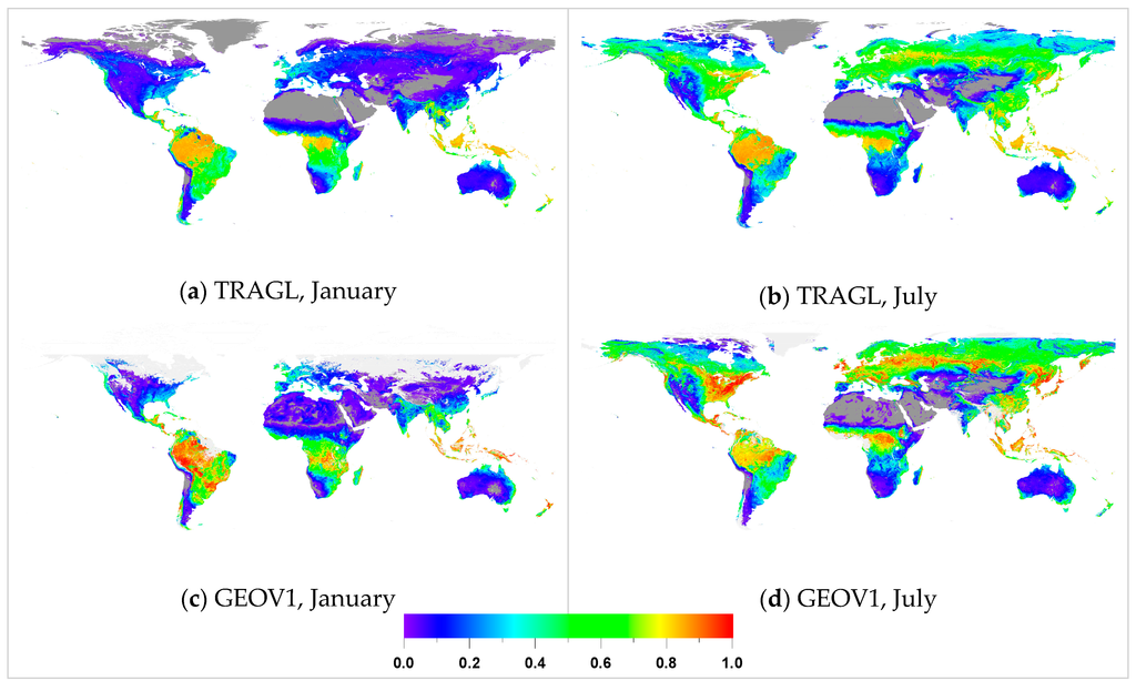 Figure 2 show the global maps of the mean values for the TRAGL and GEOV1 FCover products for January and July 2001−2005. Areas masked in dark gray correspond to pixels where the FCover values are zero, and areas masked in light gray correspond to pixels where the FCover values are missing. GEOV1 FCover product has many missing pixels in rainforest regions and in mid- and high-latitude zones of the northern hemisphere, especially in January. Camacho et al. [19] reported that the GEOV1 products presented the higher percentage of missing values at high latitudes in the northern hemisphere, with a wide variability as a function of the period of the year (it maximize in winter time), mainly due to snow coverage changes along the year as well as increase in observations under dark conditions particularly above the polar circle in winter, and also presented a large fraction of gaps (up to 50%) over the equatorial region as a consequence of the higher cloudiness. However, there are no missing data for the TRAGL FCover product, because the retrieval algorithm uses the spatially and temporally complete GLASS LAI product.