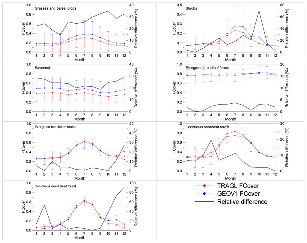 Mean values of TRAGL and GEOV1 FCover products for different biome types in each month for 2001–2005 and their relative differences.