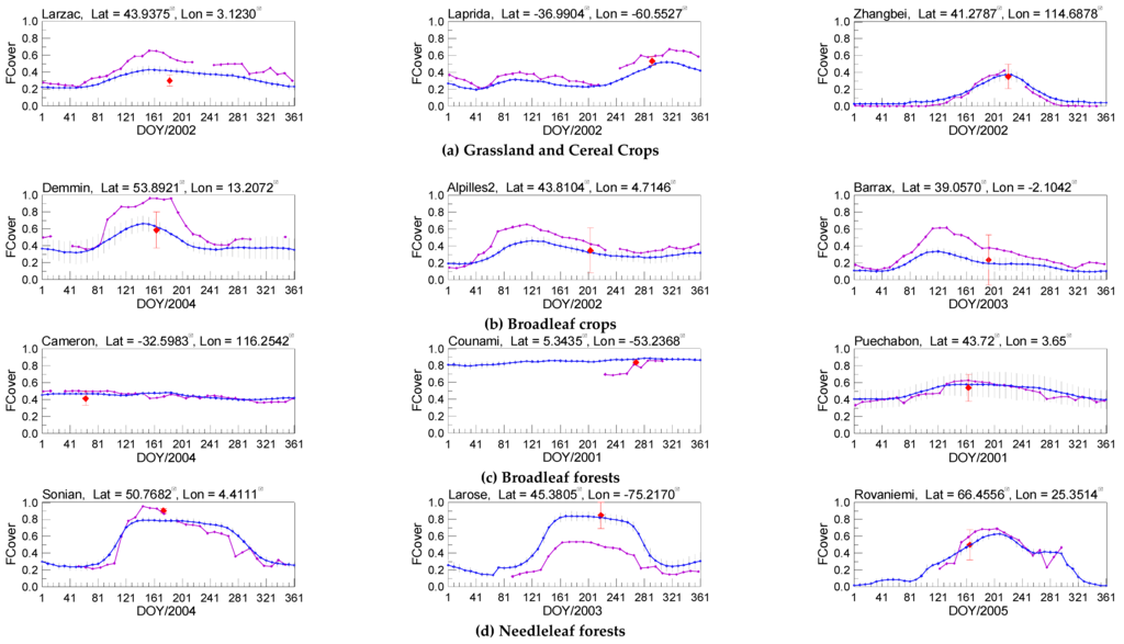 The temporal FCover profiles for the Hombori and Wankama sites with savannah biome type are shown in Figure 6e. There are large discrepancies for the Hombori site. Many GEOV1 FCover values were missing at the beginning of the growing season. During the non-growing season, the GEOV1 FCover values, at nearly zero, are almost 0.05 lower than those of TRAGL. For the Wankama site, the TRAGL FCover values are in generally good agreement with the GEOV1 FCover values, in terms of seasonal patterns. Similarly to the Hombori site, the GEOV1 FCover values are slightly lower than those of TRAGL during the non-growing season. However, the GEOV1 FCover values are slightly higher than those of TRAGL during the growing season.