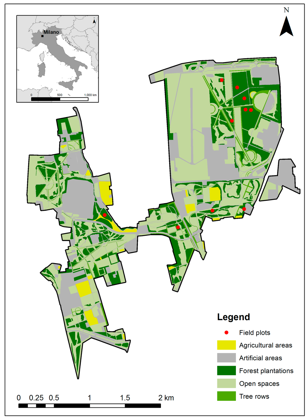 We based our study in an urban forest plantation located in the metropolitan area of Milan, Northern Italy: Parco Nord Milano (PNM) (45°53’71”N, 9°20’7”E). The entire area covers ~600 ha, with 100 ha as forest plantation and the remaining area as green space (e.g., tree rows, agricultural areas) and other recreational facilities or artificial areas (e.g., sports fields). PNM was established in the early 1980s as the result of a large afforestation plan supported by local authorities. Almost all of the trees are broadleaved. The vegetation, microclimate, and soil characteristics of the study area have been well documented by Sanesi et al. (2007) [28] and Marziliano et al. (2013) [10].