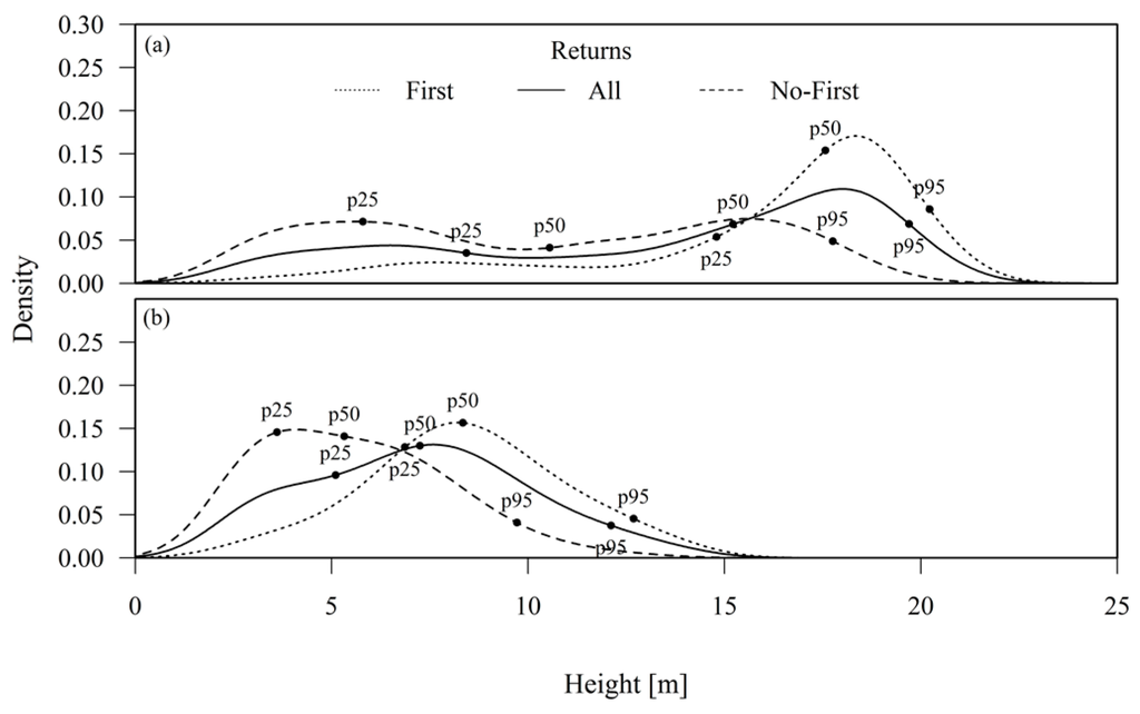 LiDAR points height distributions for two plots with different stand age. (a) Plot 1A, 29 years old; (b) Plot 23B, 17 years old. Dotted line: distribution of points belonging to the first return; solid line: distribution of points belonging to all returns; dashed line: belonging to all returns except the first.
