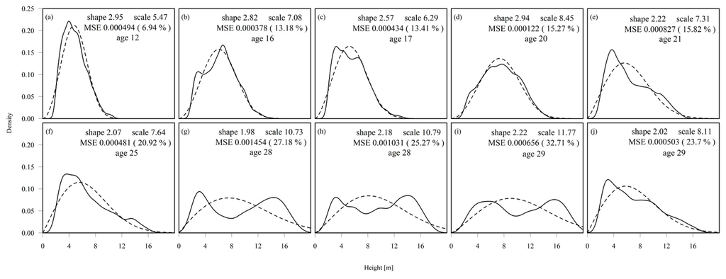 Fitted Weibull distribution for each plot: (a) plot 28C (12 years); (b) 25A (16); (c) 23b (17); (d) 18C (20); (e) 14A (21); (f) 9A (25); (g) 2A (28); (h) 2AND (28); (i) 1A (29); (j) 1D (29). Solid lines represent the height distribution of LiDAR points belonging to all return except the first. Dashed lines represent the fitted Weibull distribution. Parameters and Mean Squared Error are shown for each fit.