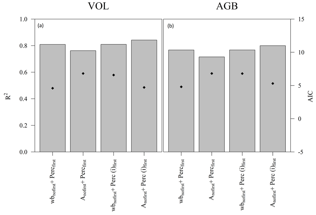 We selected the best-supported models explaining VOL and AGB from the 48 models (8 proxies of BA × 3 proxies of H × 2 presence/absence interaction term) generated from all combinations of the LiDAR-derived variables (Figure 5). The R2 ranged from 0.72 to 0.84 (Table 3). In general, models estimating VOL performed better than those estimating AGB. The lower performance of the AGB model is probably due to the presence of different tree species and consequently different wood densities, which are not delectable from LiDAR. The inclusion of the interaction term slightly increased the R2 and AIC. Given the low degrees of freedom available for the analysis (n = 10), we selected the best models using the AIC to reduce overfitting effects. Therefore, models with the interaction term were not included in the final selection.