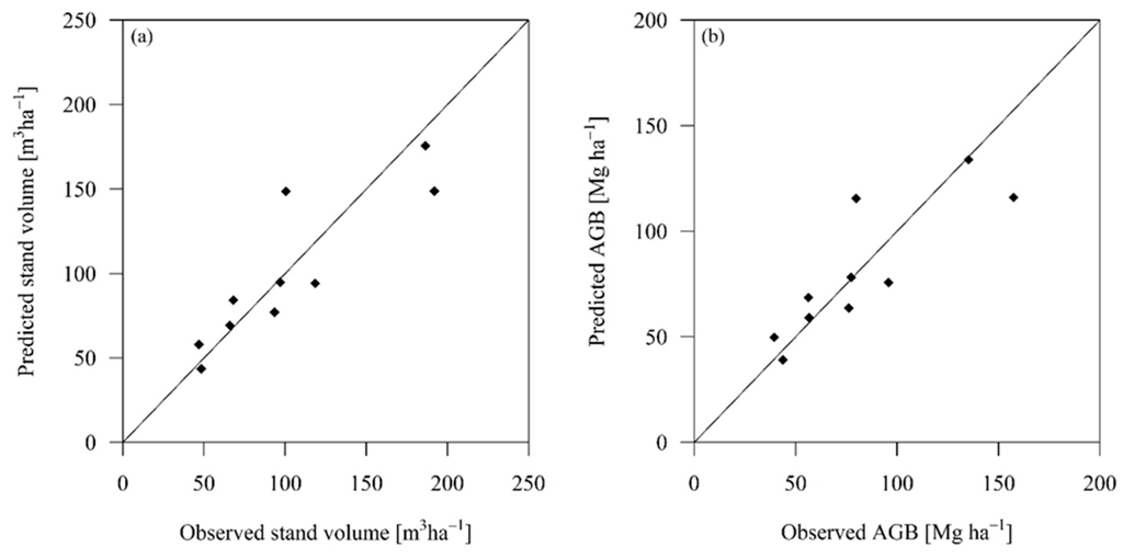 the R2 was 0.81 (p = 0.001383) for the VOL model and 0.77 (p = 0.001988) for the AGB model; the AIC was 4.59 and 4.8, respectively (Figure 6). The two models were then validated using the LOOCV procedure. The RMSE of the VOL model was 23.66 m3·ha−1 (23.3%) and the RMSEcv was 32.86 m3·ha−1 (32.3%). The RMSE of the AGB model was 19.59 Mg·ha−1 (23.9%) and the RMSEcv was 26.89 Mg·ha−1 (32.9%). For both VOL and AGB models, the close match between RMSEcv and RMSE suggested that the regressions had good predictive powers and that the models were not overfitting [41,42].