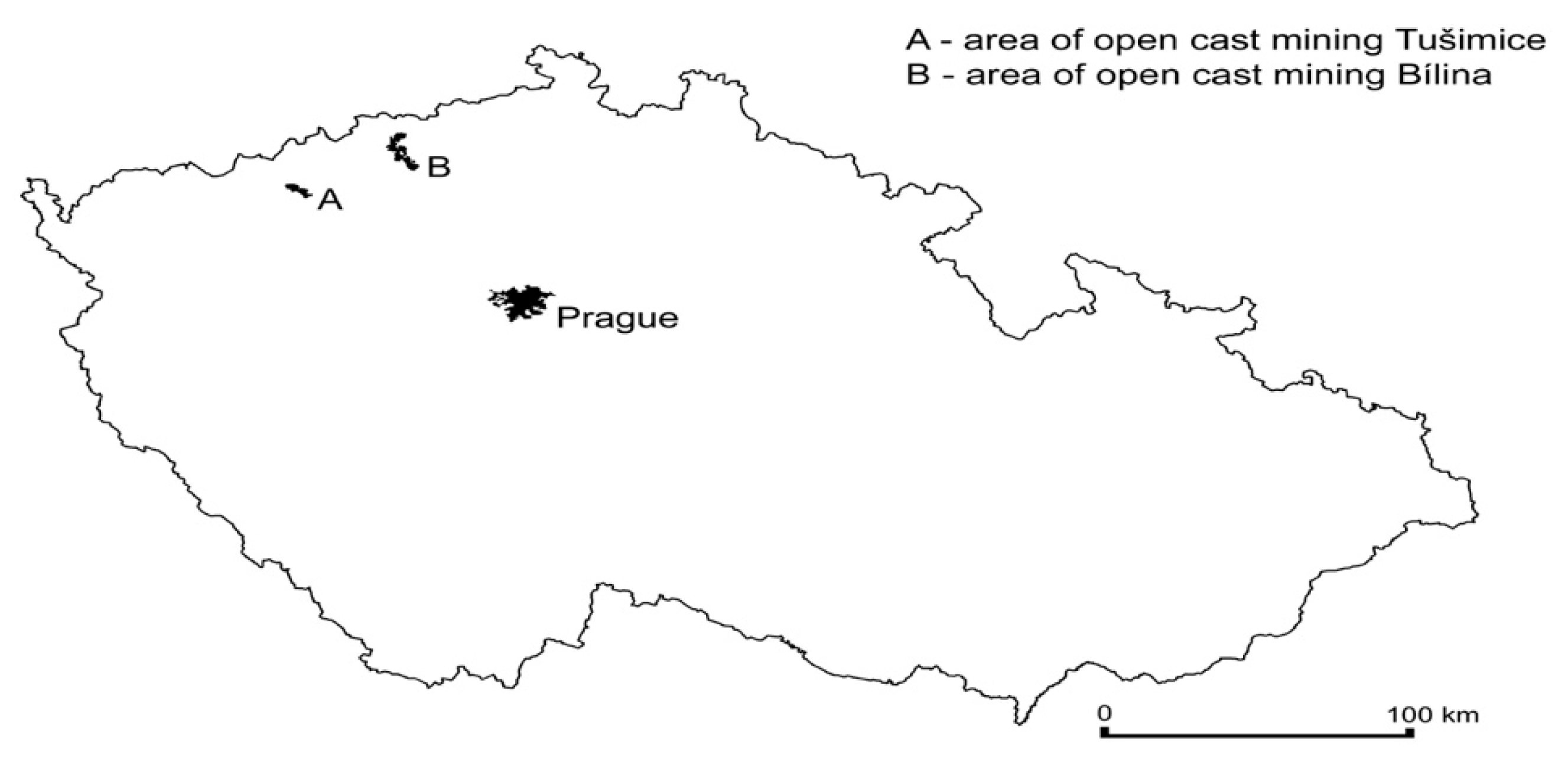 Six dumpsites in the mines Bílina and Tušimice in the Czech Republic were selected (Figure 1): Pokrok (50°60’N; 13°71’E), Radovesice (50°54’N; 13°83’E), Březno (50°39’N; 13°36’E), Merkur (50°41’N; 13°30’E), Prunéřov (50°42’N; 13°28’E) and Tumerity (50°37’N; 13°31’E).