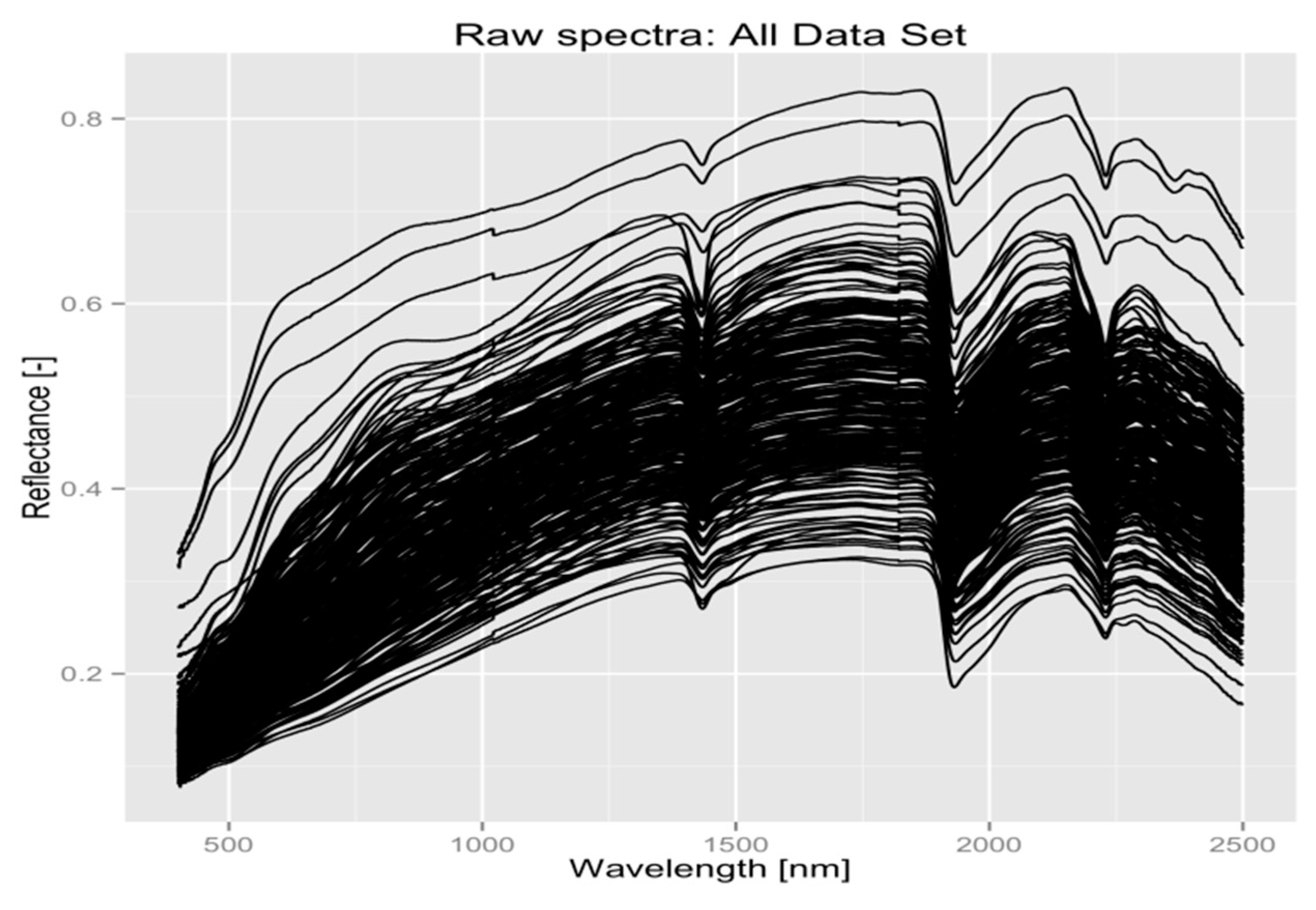 A visual assessment of the spectra permitted to remove parts of spectra that are known as the noisiest parts at the edges of the spectrum, and the final spectral library considered the spectral range from 400–2450 nm. Sets of spectra were defined qualitatively by identifying the positive and negative peaks (Figure 2), which appear at particular wavelengths [3].