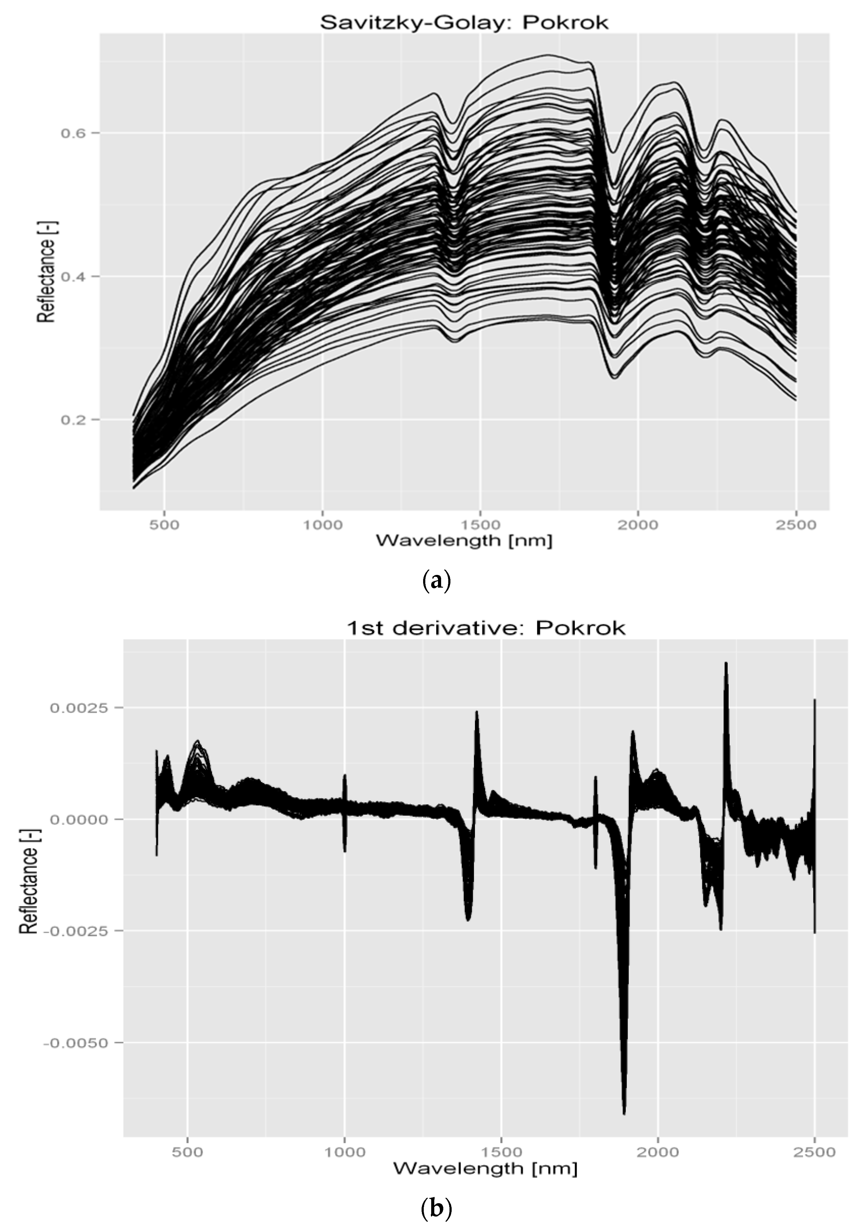 Smoothed only (a) and smoothed and first derivative preprocessed (b) soil spectra.