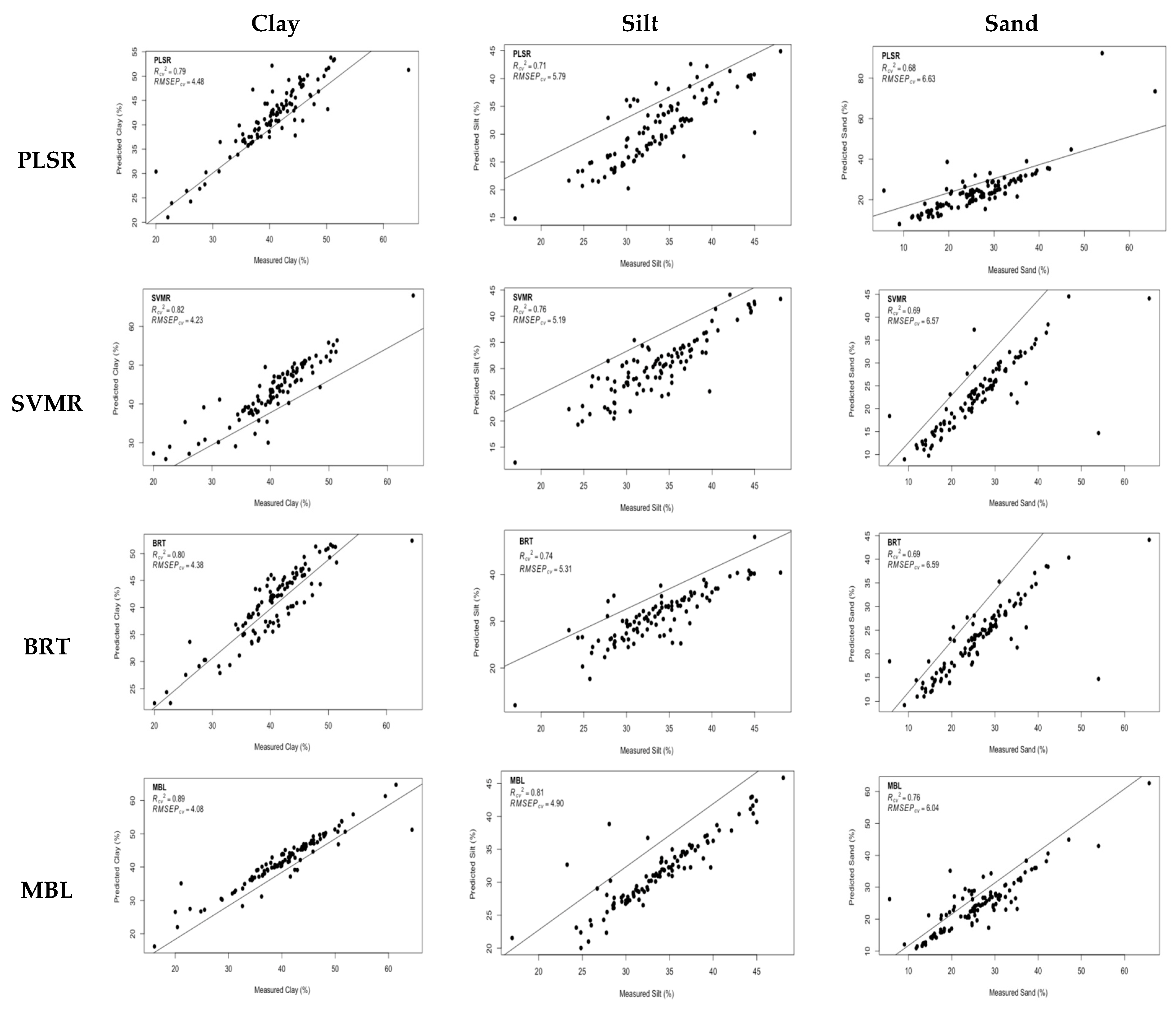 In the multivariate calibration, based on R2cv and RMSEPcv, which have been reported as standard methods for the validation of the prediction models, the most consistent estimates were commonly gained for the clay fraction. This may be related to a different rate of uncertainty in the determination of each particular textural class by the hydrometer method [85]. Compared to PLSR, SVMR, BRT and MBL gave smaller RMSEPcv and larger R2cv for the prediction of clay, silt and sand (Table 2).