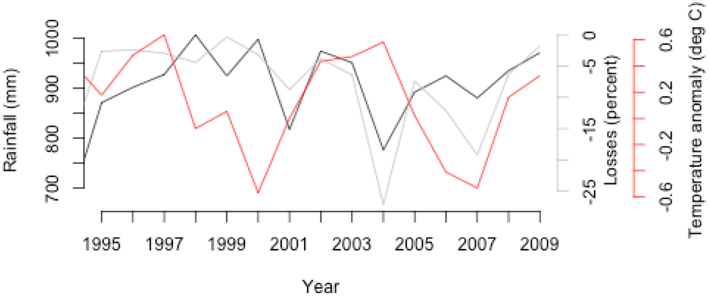 Cotton in Zambia is almost exclusively rain-fed. It is to be expected, therefore, that when rain is low, losses are high. This is supported by Figure 1, which shows a convincing association between average losses over the 38 study locations and peak wet season rainfall (November–March rainfall) averaged over the domain shown (R2 of 0.65, which is significant at the 95% level). Figure 1 suggests that temperature plays a secondary role (R2 of 0.32), although the heavy losses in 2004 are associated with high temperatures as well as low rainfall. Note that Figure 1 includes only the post-1995 period, because prior to this, the loss data are based heavily on a yield stress model, and hence cannot be considered independent of the rainfall.