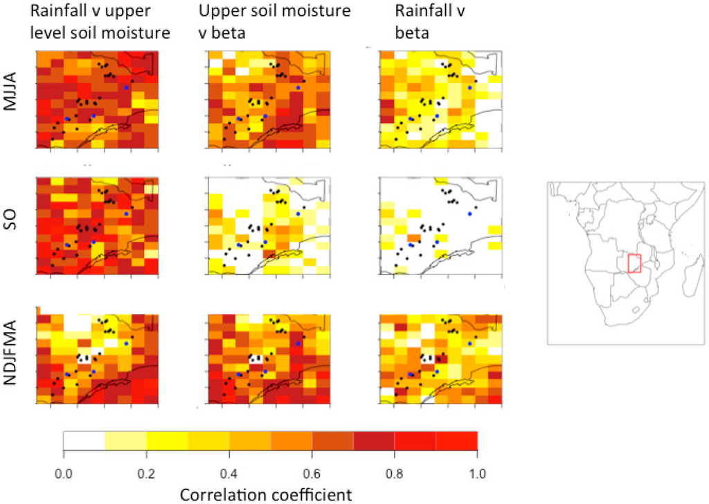 Zambia’s economic troubles exacerbate the population’s vulnerability to climate variability, particularly to drought. Robust WII could mitigate some of these risks, especially if it can be implemented at a large scale. As was described in Section 1, the fair implementation of drought WII requires a clear connection between rainfall and root zone soil moisture, i.e., a consistent progression from meteorological to agricultural drought. The progression from rainfall deficit to agricultural drought is illustrated by Figure 2, which shows the correlations between rainfall, upper level soil moisture and beta, for JULES driven with a single ensemble realization of rainfall. Correlation coefficients are calculated for inter-annual variability in variables of interest for the cool dry season (May–August), the hot dry season (September–October) and the rainy season (November–April). The time span over which the correlations are calculated is 1995–2010, which means that correlations over ~0.5 can be considered significant at the 95% level. The correlation between rainfall and upper level soil moisture (left column) relates to the infiltration of rainfall into the top layer of soil. The correlation between upper level soil moisture and beta (middle column) relates to percolation of water from the top layer of soil to the root zone. The correlation between rainfall and beta (right column) illustrates the ensuing link between rainfall and moisture availability to plants.