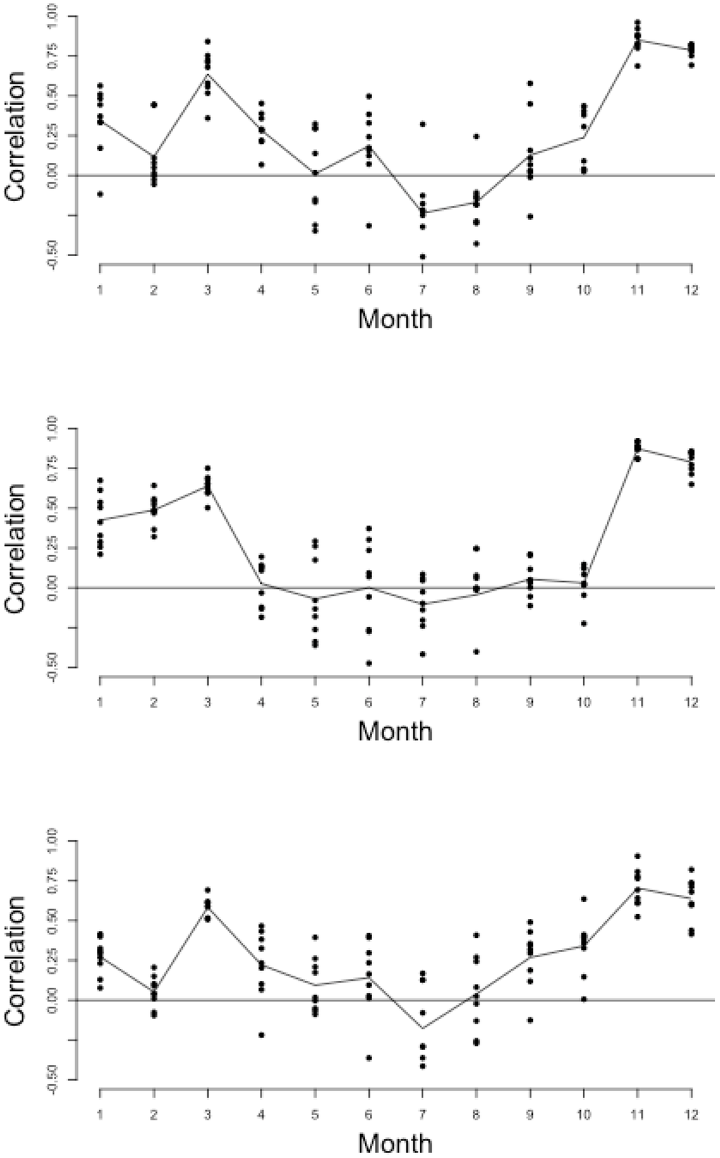 Interannual correlation between monthly mean rainfall and monthly mean beta for (from top to bottom) Chikanta, Magoye, Makafu. The dots are for individual ensemble rainfall realizations and the black line is mean correlation.