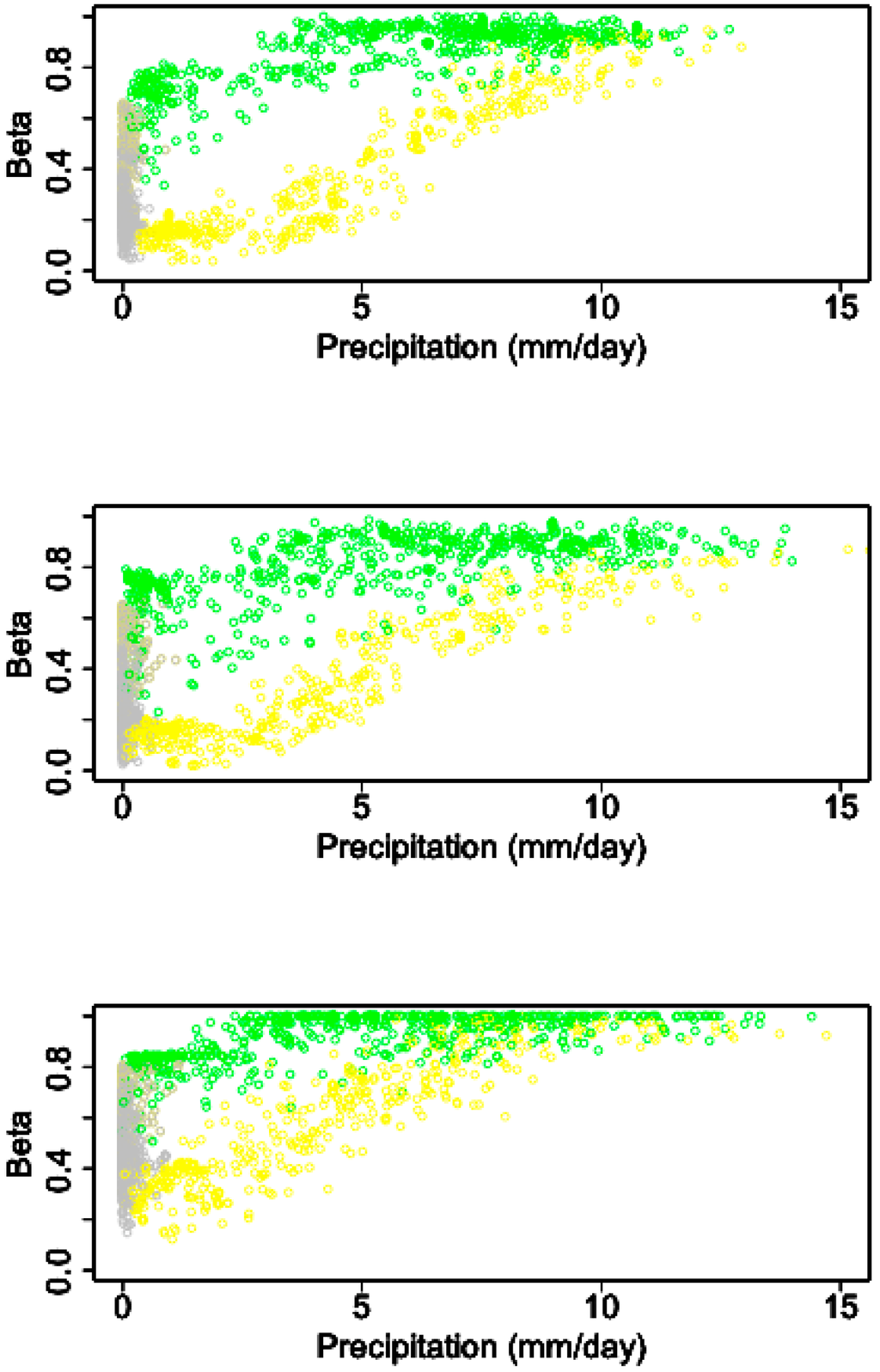 Precipitation versus the JULES beta parameter for (from top to bottom) Chikanta, Magoye, and Makafu for May–September (grey circles), October-December (yellow circles), and January–April (green circles).