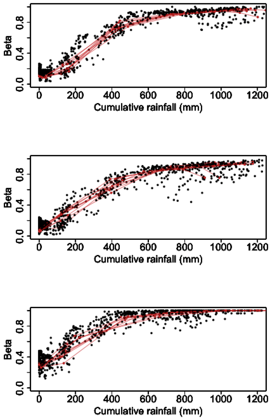 The relationship between rainfall and beta is explored further in Figure 5, which shows plots of beta versus cumulative precipitation during the peak of the rainy season (November–March). Broadly speaking, cumulative rainfall is proportional to beta, until beta approaches 1. The clarity of the link, however, varies from one locality to another. In particular, at Magoye (middle plot), there is more noise than at the other locations.