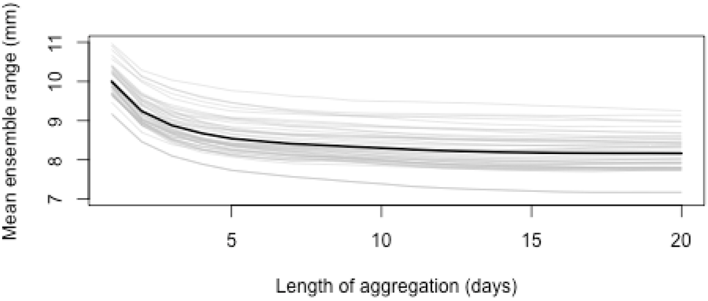 Time length of aggregation plotted against the mean ensemble range for the pixel containing each of the localities shown in Figure 2. The pale grey lines relate to individual time series and the bold line is the mean.