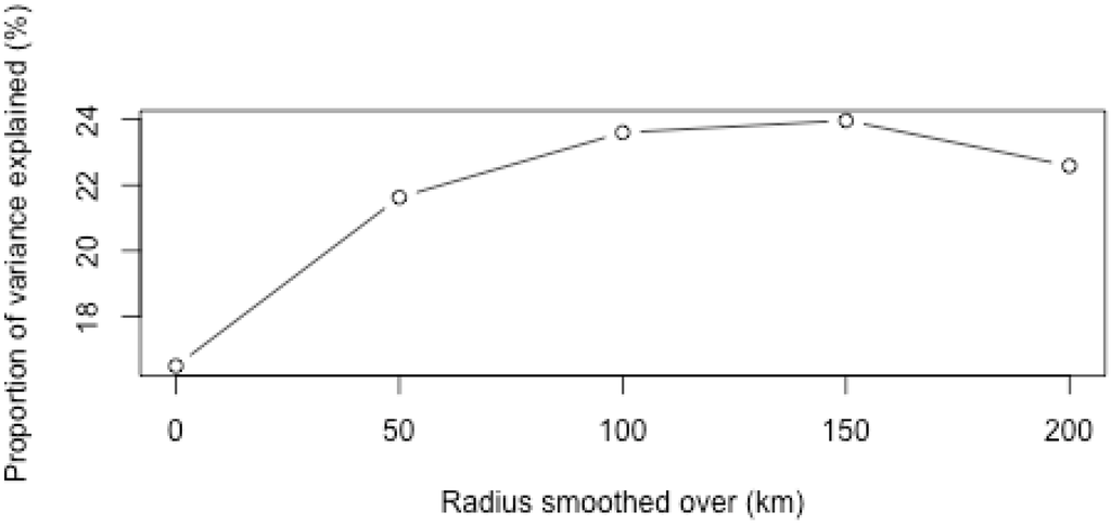 Box side length of region averaged over (smoothing radius), versus the percentage of variance in beta explained by total precipitation for January.