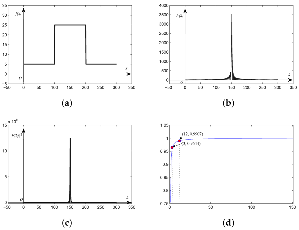 The one-dimensional simulated square wave discrete signal plotted in Figure 1a is taken as an example for frequency and power spectrum analysis. The frequency and power spectrum of the original signal are illustrated in Figure 1b,c, respectively. As shown in Figure 1b, we can see that the magnitude of the DC component is much higher than the other frequency components. Meanwhile, the magnitude of these frequency components decreases sharply with distance from the DC component. The tendency of the power spectrum is more distinct than that of the frequency spectrum, indicating that the energy of the spectral signature concentrates around the DC component. The curve shown in Figure 1d is the ratio of the frequency energy of the harmonics between the DC component and every other frequency component, to all frequency energy. It can be seen that the energy of the first three harmonics is up to 95%, and the energy of the first twelve harmonics is over 99%.