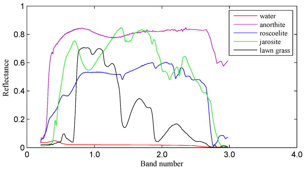 To analyze the frequency spectrum of the real spectral signature, five typical spectral signatures, including water, anorthite, roscoelite, jarosite and lawn grass in the United States Geological Survey (USGS) reflectance spectral library, are taken as samples for experimental frequency spectrum analysis. Figure 2 shows that the five spectral signatures are markedly different from each other.