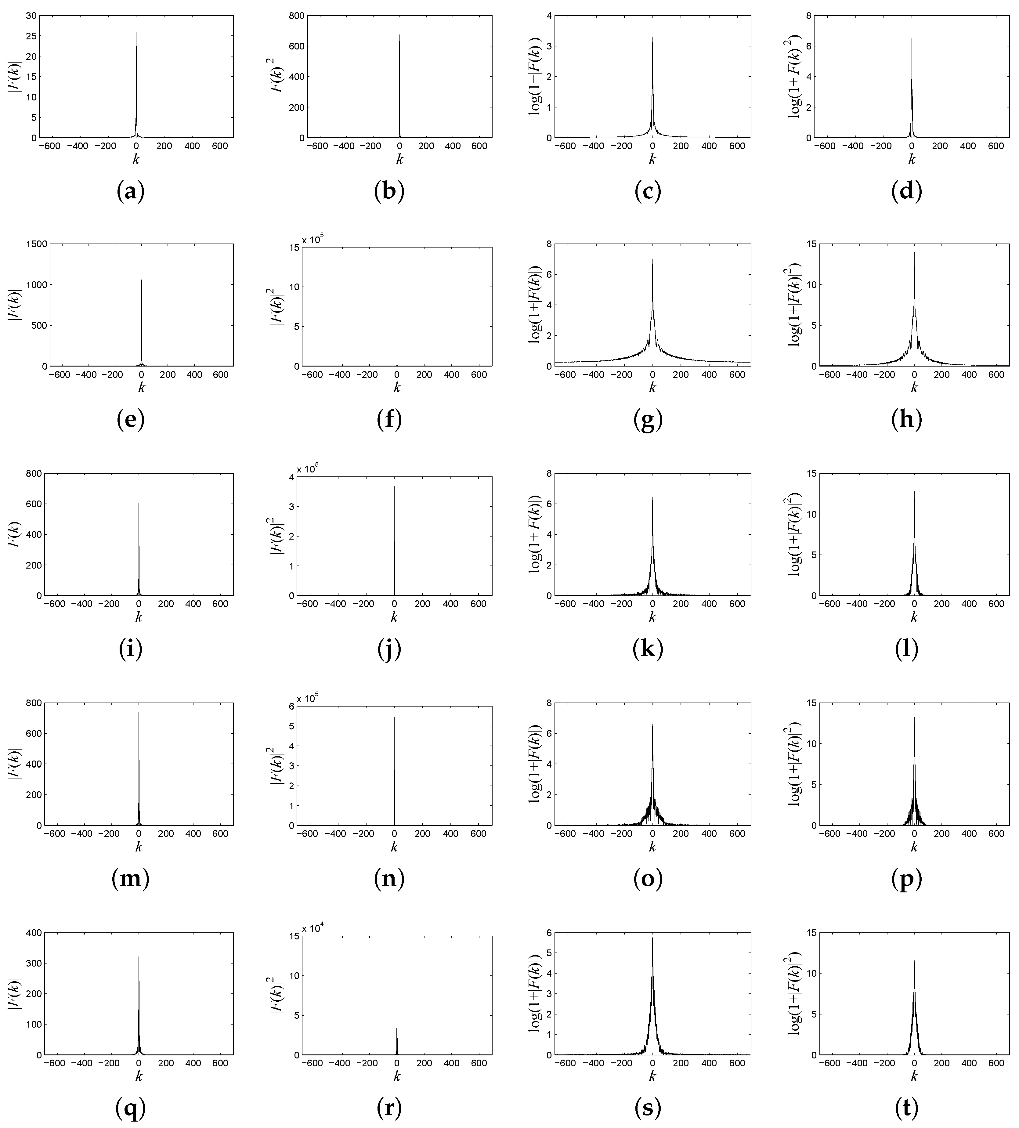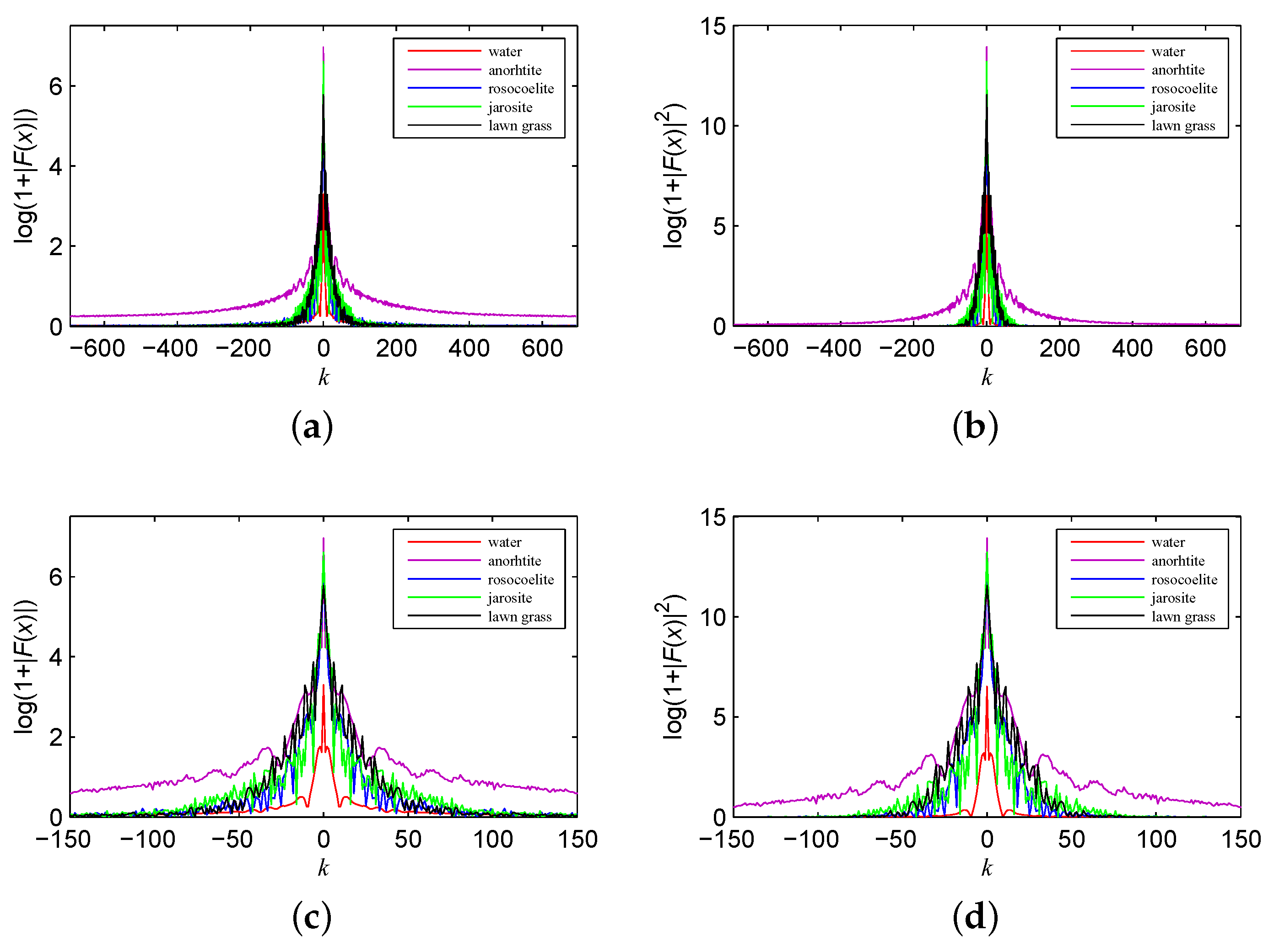 (a) The frequency spectrum of the spectral signature of water; (b) the power spectrum of the spectral signature of water; (c) the logarithmic form of the frequency spectrum of the spectral signature of water; (d) the logarithmic form of the power spectrum of the spectral signature of water; (e) the frequency spectrum of the spectral signature of anorthite; (f) the power spectrum of the spectral signature of anorthite; (g) the logarithmic form of the frequency spectrum of the spectral signature of anorthite; (h) the logarithmic form of the power spectrum of the spectral signature of anorthite; (i) the frequency spectrum of the spectral signature of roscoelite; (j) the power spectrum of the spectral signature of roscoelite; (k) the logarithmic form of the frequency spectrum of the spectral signature of roscoelite; (l) the logarithmic form of the power spectrum of the spectral signature of roscoelite; (m) the frequency spectrum of the spectral signature of jarosite; (n) the power spectrum of the spectral signature of jarosite; (o) the logarithmic form of the frequency spectrum of the spectral signature of jarosite; (p) the logarithmic form of the power spectrum of the spectral signature of jarosite; (q) the frequency spectrum of the spectral signature of lawn grass; (r) the power spectrum of the spectral signature of lawn grass; (s) the logarithmic form of the frequency spectrum of the spectral signature of lawn grass; (t) the logarithmic form of the power spectrum of the spectral signature of lawn grass.