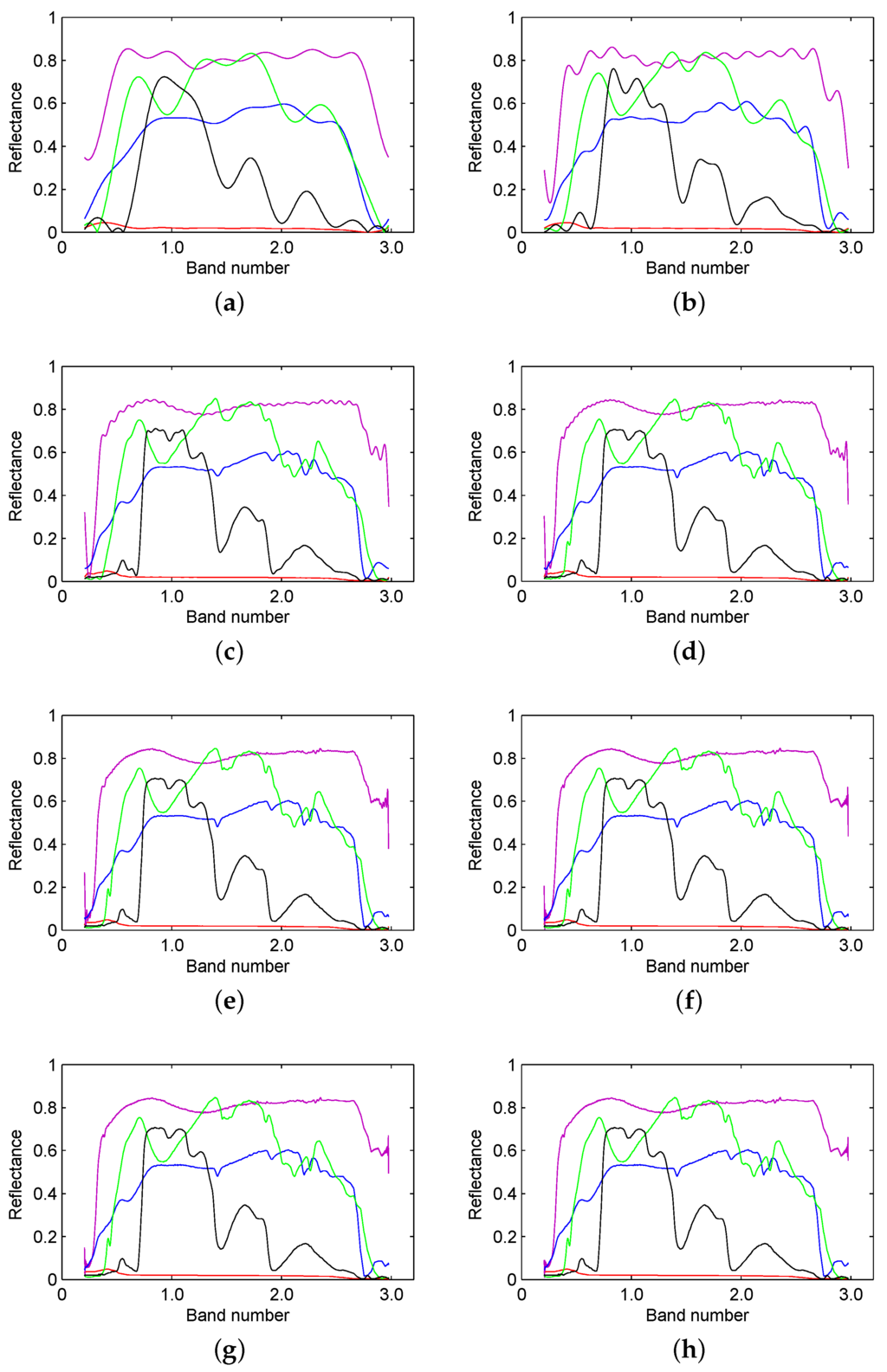 Reconstruction results from (a) 1%; (b) 2%; (c) 5%; (d) 10%; (e) 20%; (f) 40%; (g) 60% and (h) 80% of the low frequency spectrum from the spectral signatures of water, anorthite, roscoelite, jarosite and lawn grass.