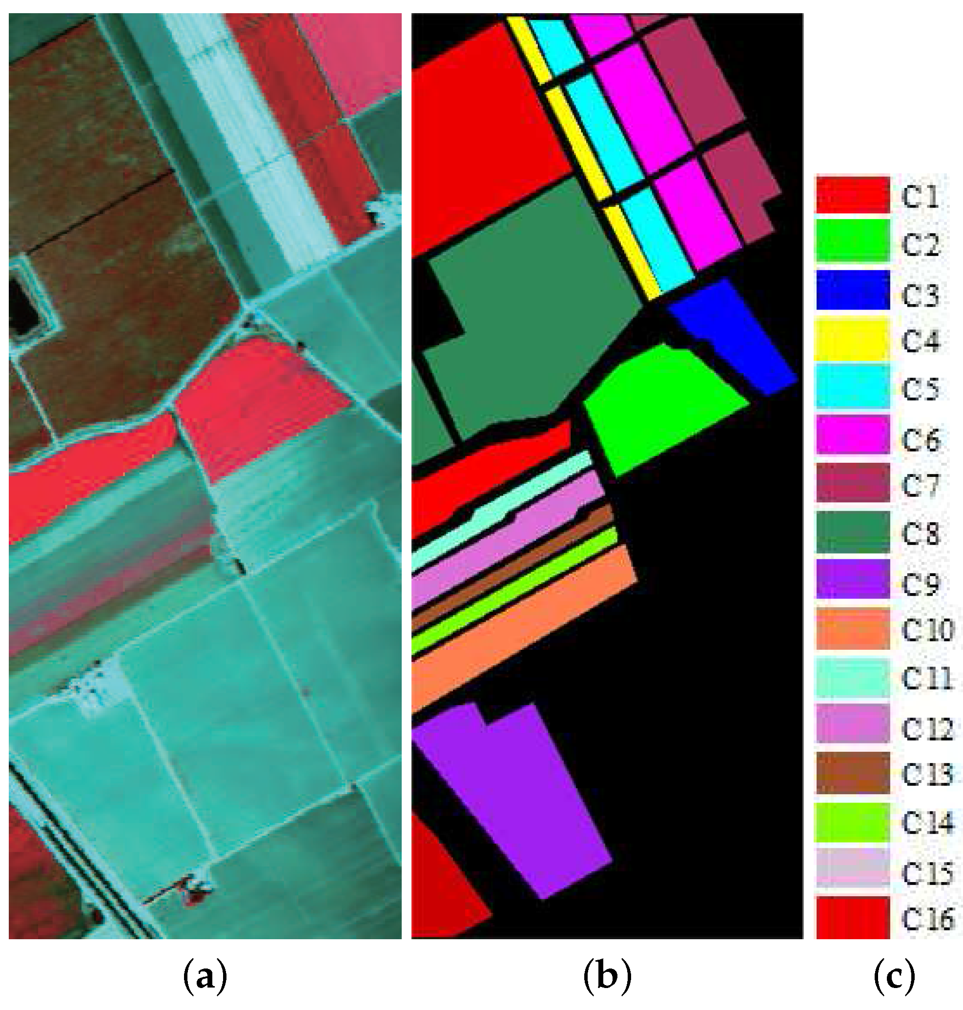 This dataset was acquired by the Airborne Visible/Infrared Imaging Spectrometer (AVIRIS) over Salinas Valley, California, in 1998. The original data contains 217 × 512 pixels and 220 spectral channels, which range from 0.4 to 2.45 m, covering the visible and infrared spectra. In our experiment, we discarded the 20 water absorption bands. The data were taken at a low altitude with a spatial resolution of 3.7 m. The dataset shown in Figure 6a, which is the false color composite image of Bands 18, 30 and 68, presents a vegetation scenario, including broccoli, corn, fallow, stubble, celery, vineyard and romaine lettuce. The main advantage of this dataset is that there is a ground truth map, shown in Figure 6b, including 16 land cover classes prepared at the time of image acquisition. The details of the land cover classes and sample number is listed in Table 1.