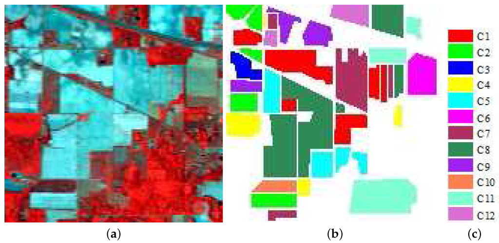 The Indian Pines hyperspectral image is a dataset gathered by the AVIRIS sensor over the Indian Pines test site in northwestern Indiana and consists of 145 × 145 pixels with 224 bands. This dataset is commonly used for classification experiments because of the high similarity between spectral signatures of different classes and heavily mixed pixels. The data and ground truth map are shown in Figure 7a,b. The number of bands is initially reduced to 200 by removing water absorption bands and noisy bands. The original ground truth has actually 16 land cover classes, but some classes have a very small number of samples; therefore, 12 classes that have a higher number of samples were used in the experiment. The samples corresponding to each of these classes are shown in Table 2.