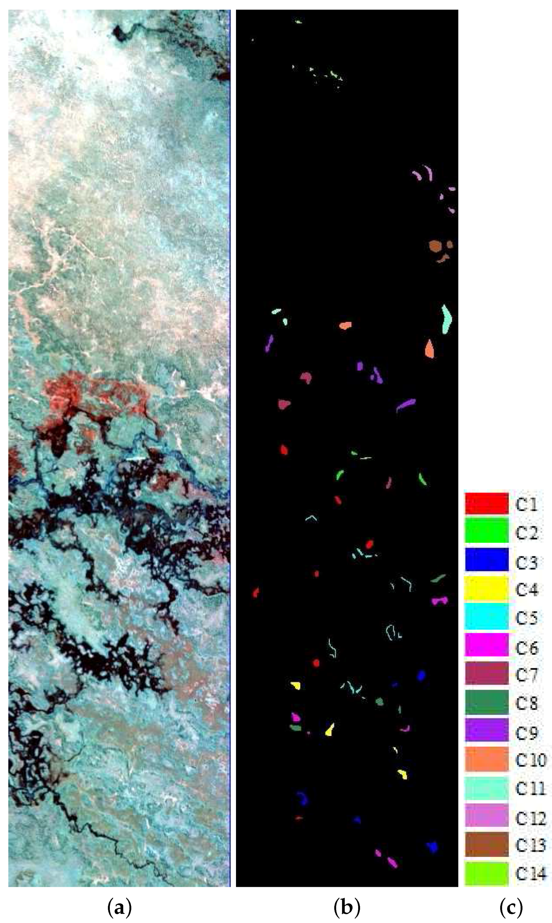(a) False color hyperspectral remote sensing image over Okavango Delta, Botswana (using Bands 149, 51 and 31); (b) ground truth of the labeled area with twelve classes of land cover: water, hippo grass, floodplain grasses 1, floodplain grasses 2, reeds 1, riparian, firescar 2, island interior, acacia woodlands, acacia shrublands, acacia grasslands, short mopane, mixed mopane and exposed soils; (c) the legend of the classes of land cover for ground truth