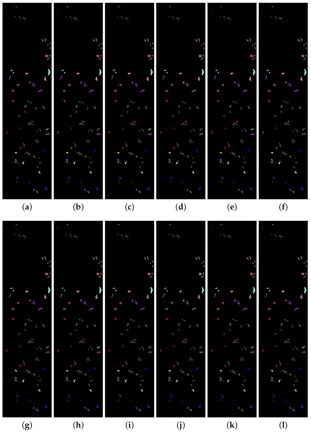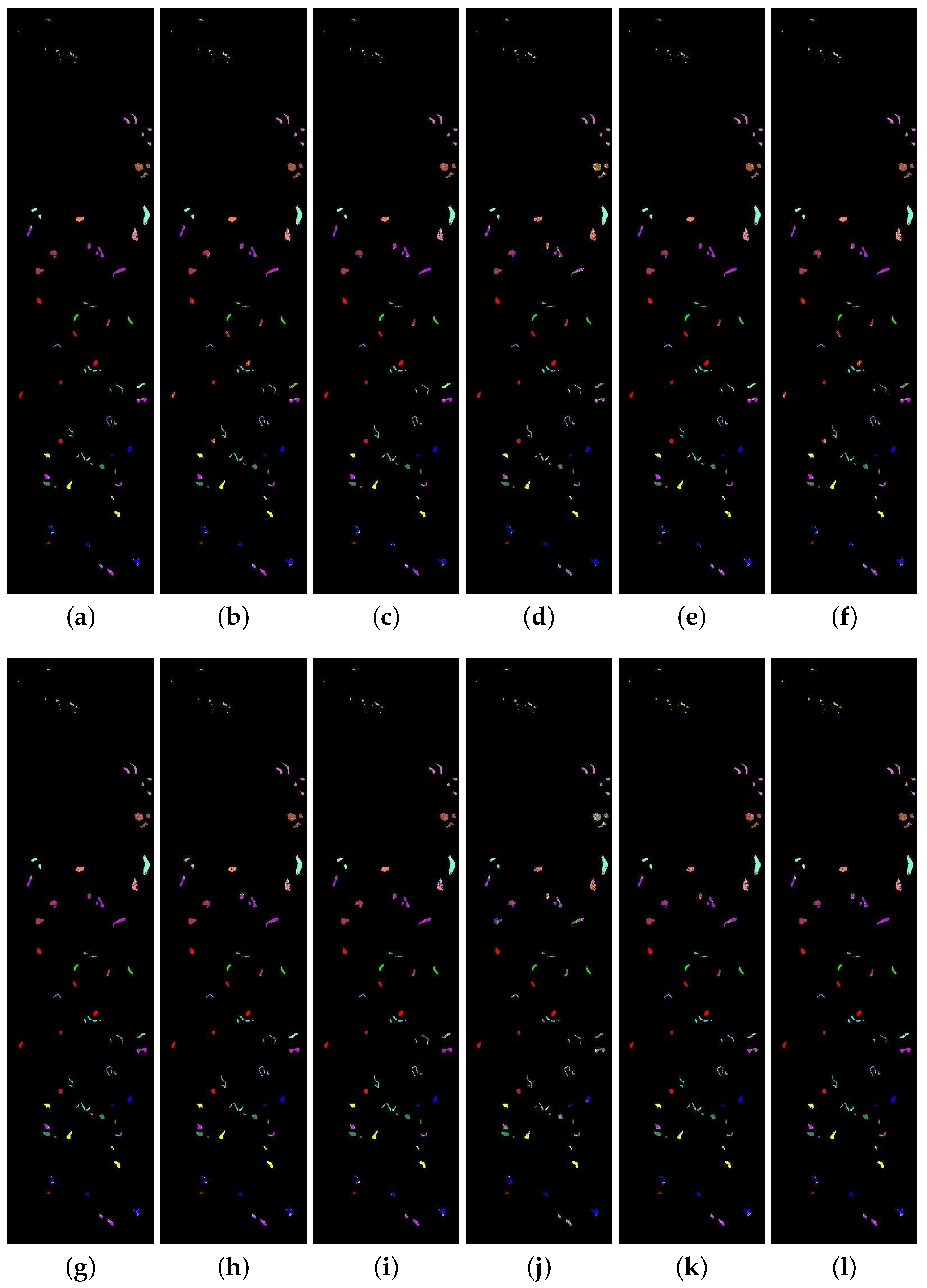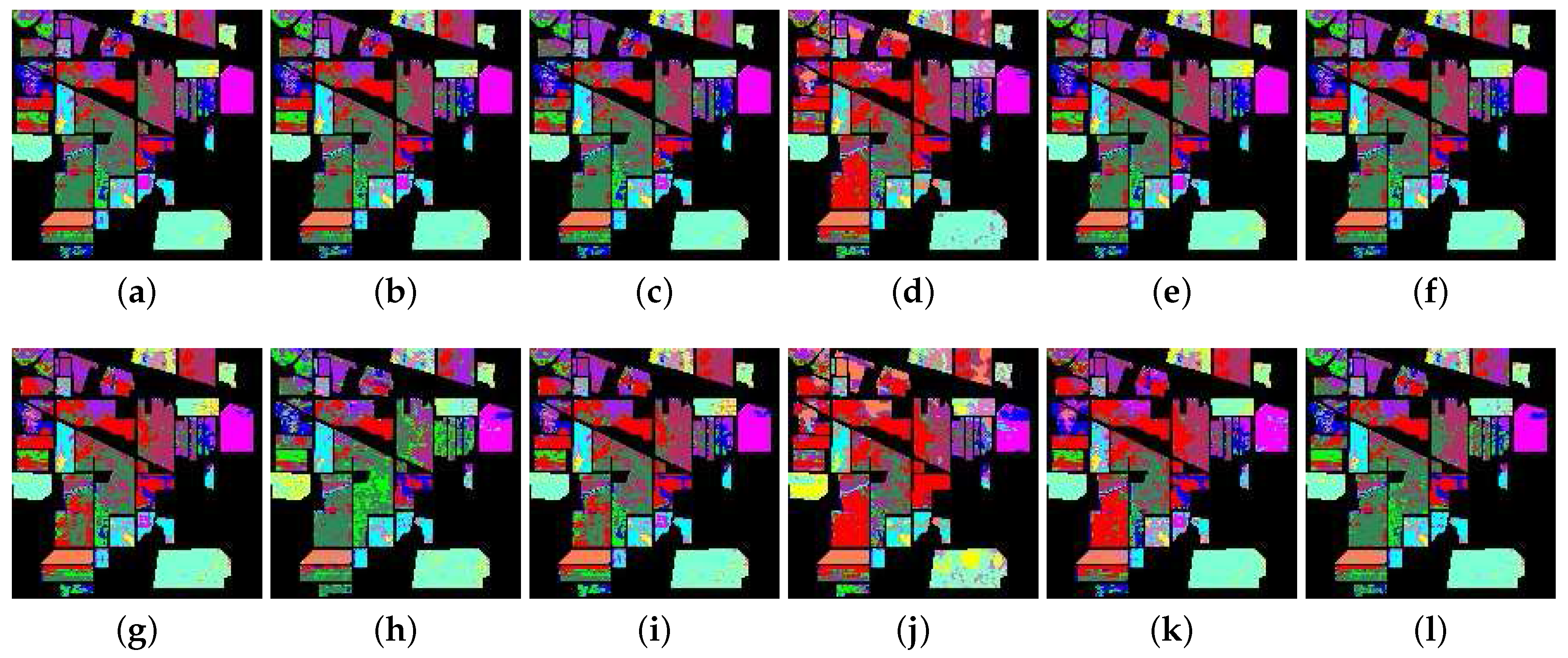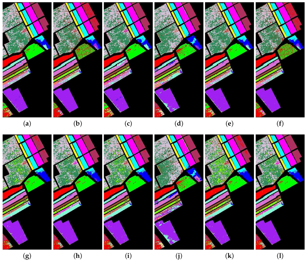 The classification map from the hyperspectral data on Salinas Valley. The first row is the result from the SAM, SID, SCM, ED, NED, and SsS methods, respectively; the second row is the result from the F-SAM, F-SID, F-SCM, F-ED, F-NED and F-SsS methods, respectively. (a) SAM; (b) SID; (c) SCM; (d) ED; (e) NED; (f) SsS; (g) F-SAM; (h) F-SID; (i) F-SCM; (j) F-ED; (k) F-NED; (l) F-SsS.