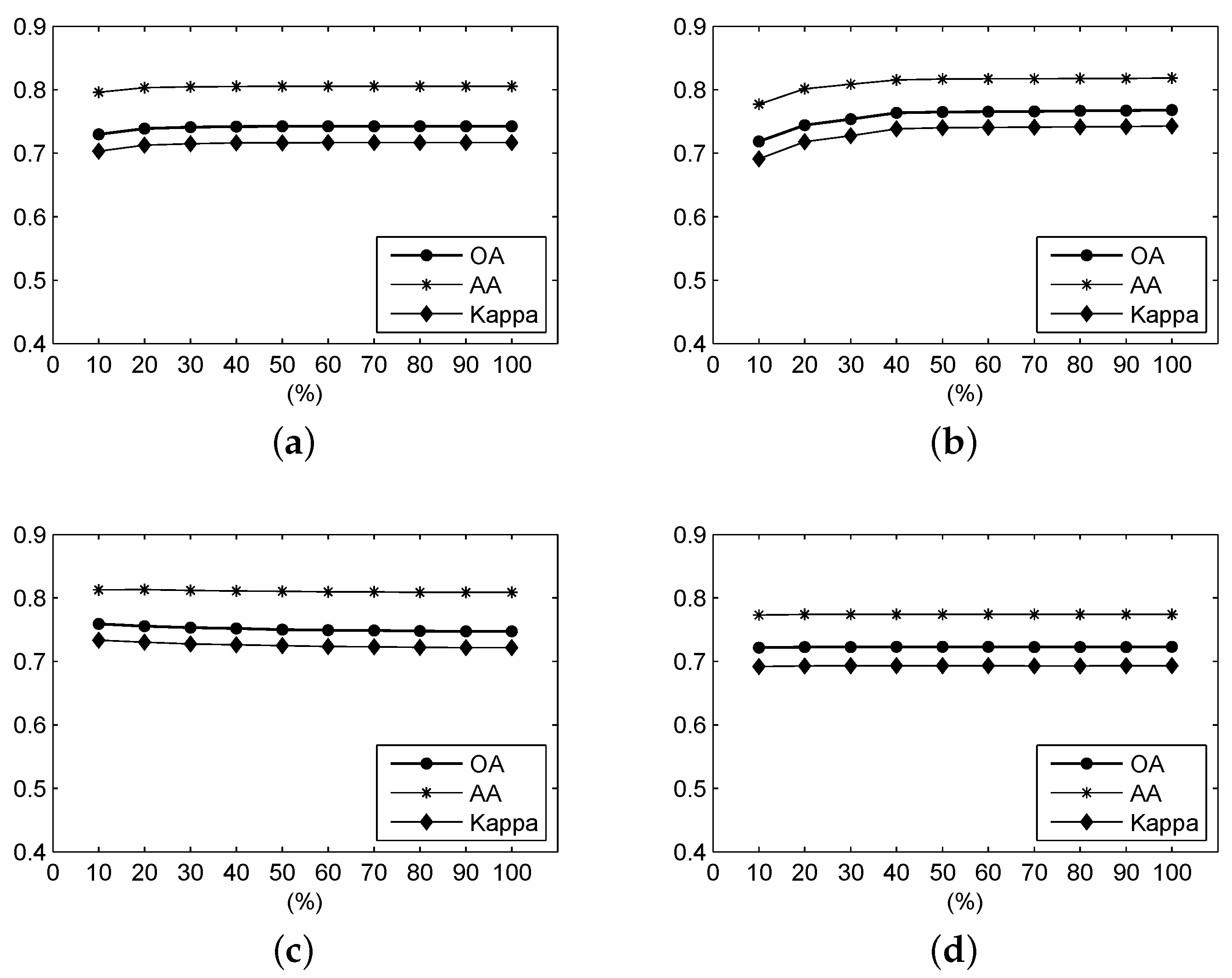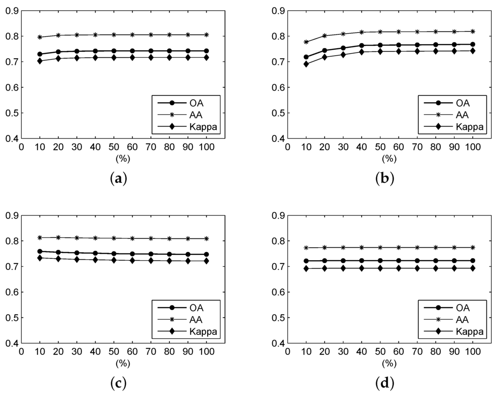 Figure 10 shows the OA, AA and Kappa coefficient of the classification results from different ratios of the frequency spectrum using frequency-based measures over the Salinas Valley scene. It can be seen that, for the F-SAM, F-SID, F-NED and F-SsS measures, when the ratio is larger than 0.2, the accuracies tend to be stable and exhibit higher values. For the F-SCM measure, the accuracies also tend to be stable when the ratio is over 0.2. However, these accuracies become lower than those with ratios lower than 0.2. The F-ED measure always exhibits very stable accuracies, which have been influenced by the ratio of the frequency spectrum.