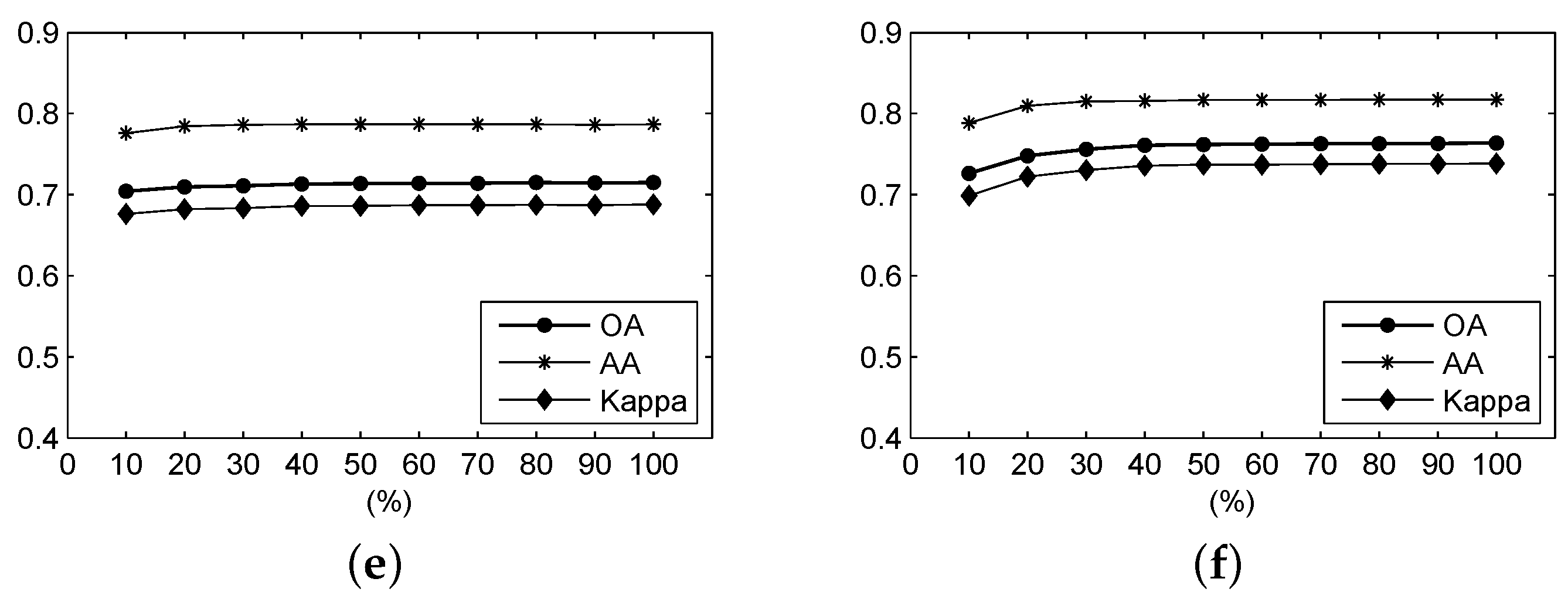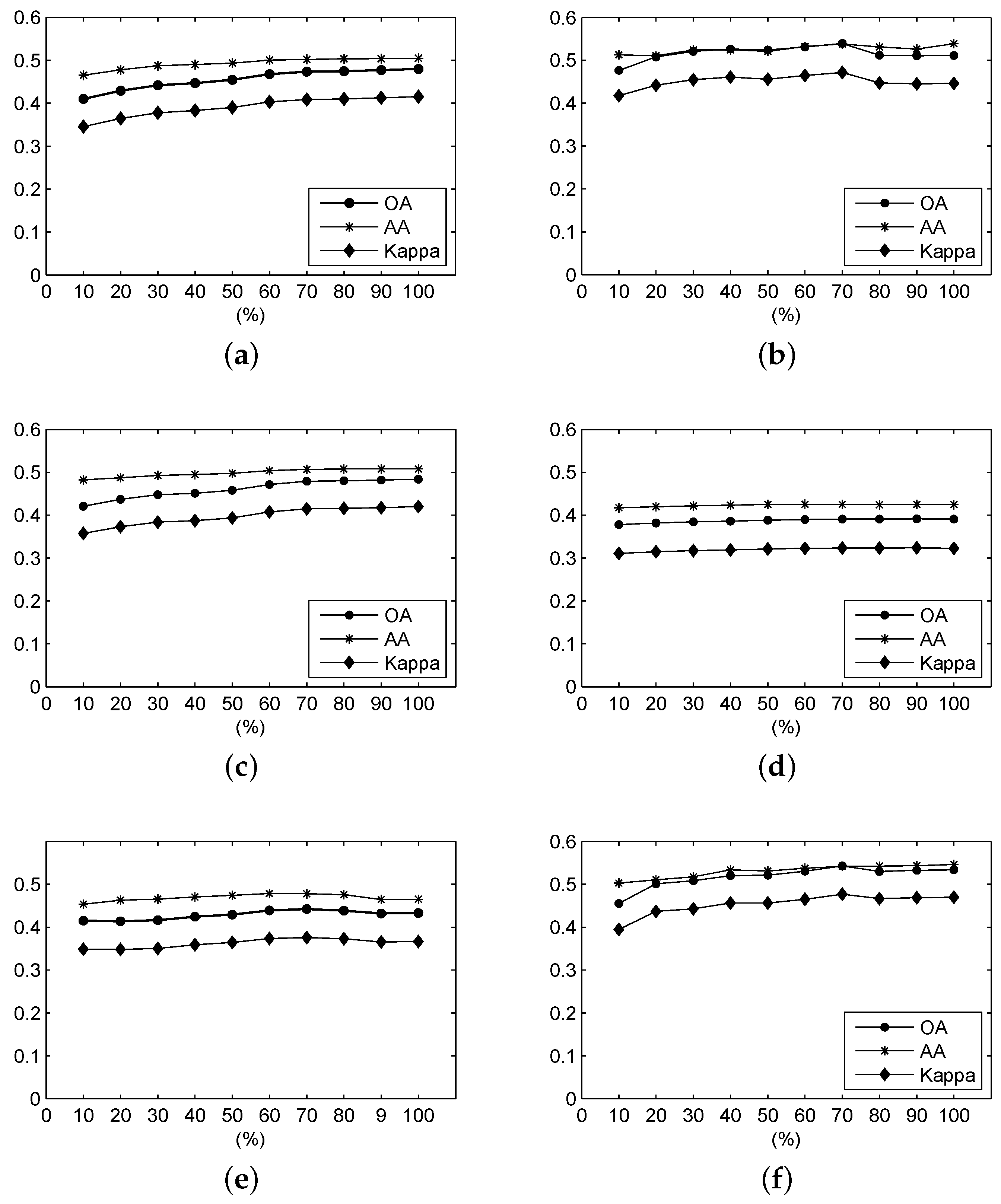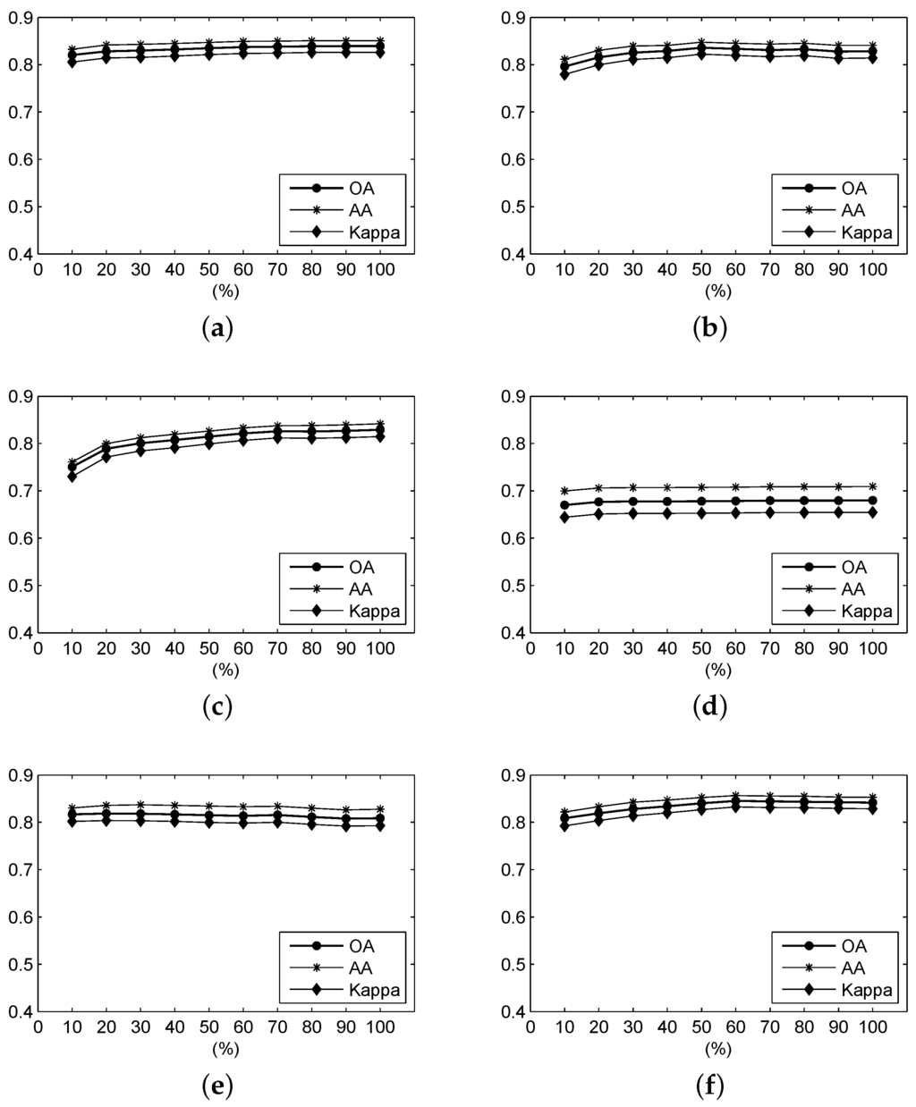 For the Salinas Valley data, the OA, AA and Kappa coefficient of the classification result under different parameters using (a) F-SAM, (b) F-SID, (c) F-SCM, (d) F-ED, (e) F-NED, and (f) F-SsS.