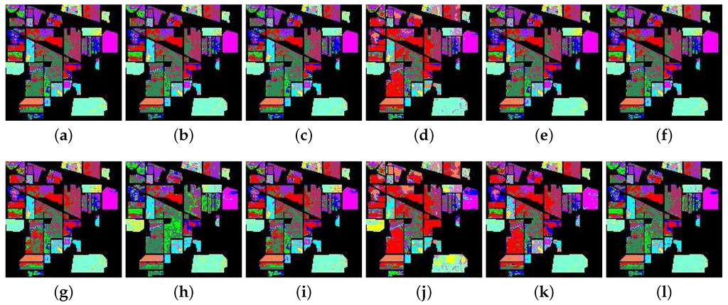 The classification map from the hyperspectral data on Indian Pines. The first row is the result from the SAM, SID, SCM, ED, NED, and SsS methods, respectively; the second row is the result from the F-SAM, F-SID, F-SCM, F-ED, F-NED and F-SsS methods, respectively. (a) SAM; (b) SID; (c) SCM; (d) ED; (e) NED; (f) SsS; (g) F-SAM; (h) F-SID; (i) F-SCM; (j) F-ED; (k) F-NED; (l) F-SsS.