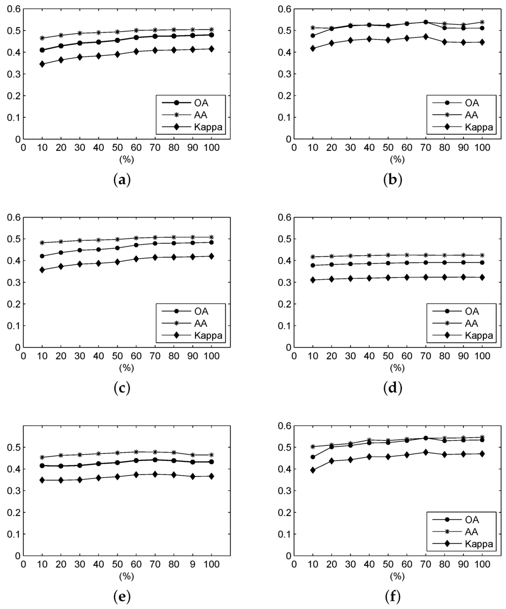 - Camps-Valls, G.; Marsheva, T.V.B.; Zhou, D.Y. Semi-supervised graph-based hyperspectral image classification. IEEE Trans. Geosci. Remote Sens. 2007, 45, 3044–3054. [Google Scholar] [CrossRef]