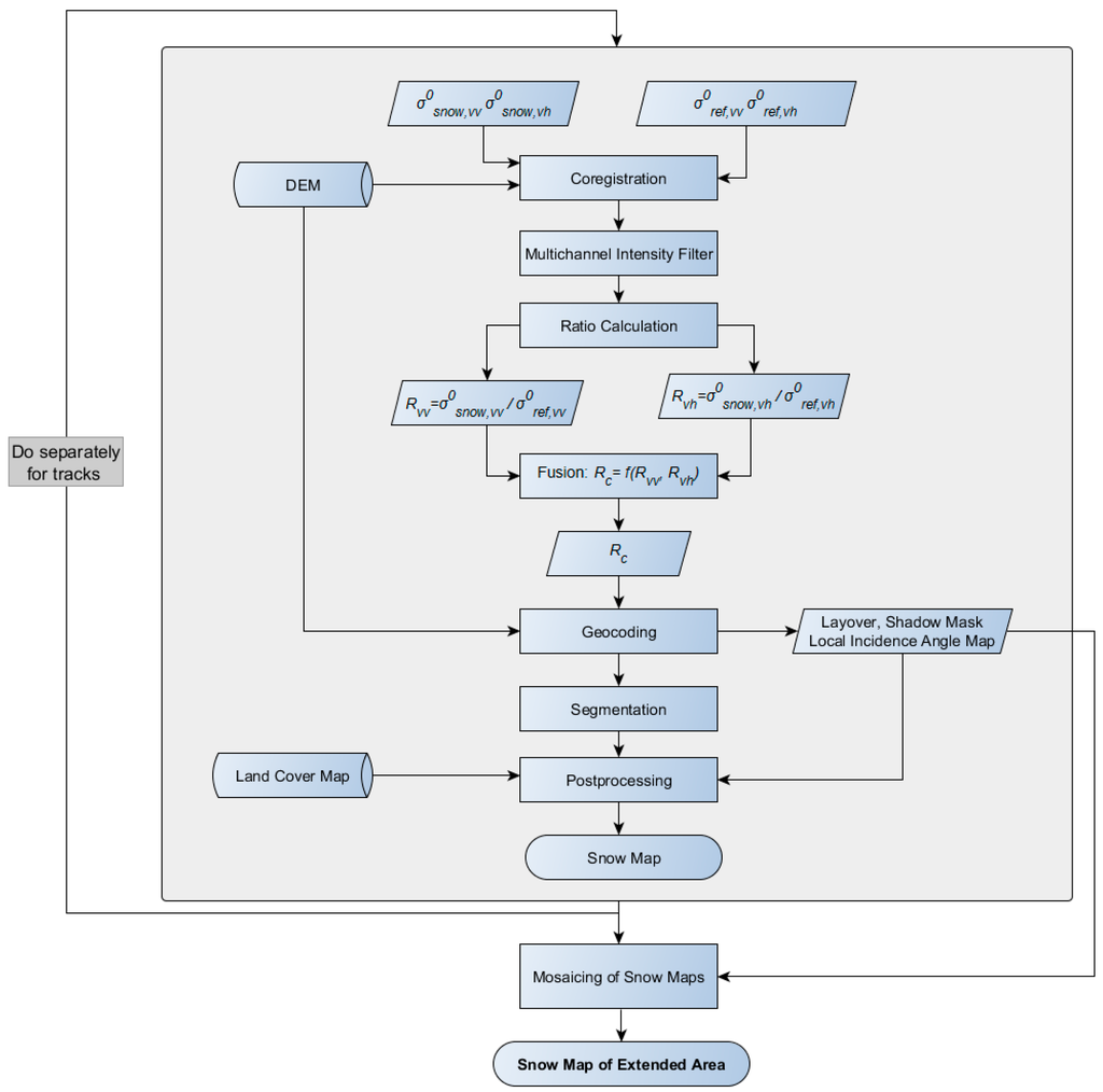 Level-1 data (swath-based SAR images) are available in two main categories: Single Look Complex imagery (SLC) and Ground Range Detected imagery (GRD). GRD products consist of focused SAR data that have been detected, multi-looked and projected to ground range using an Earth ellipsoid model [19]. We use SLC images for generating the snow cover product, in order to exploit the original backscatter statistics for speckle filtering and classification, and to perform terrain-corrected geocoding using high resolution digital elevation models (DEMs). The geolocation accuracy of IW SLC products is 1.5 m in LOS and 2.5 m in azimuth [20].
