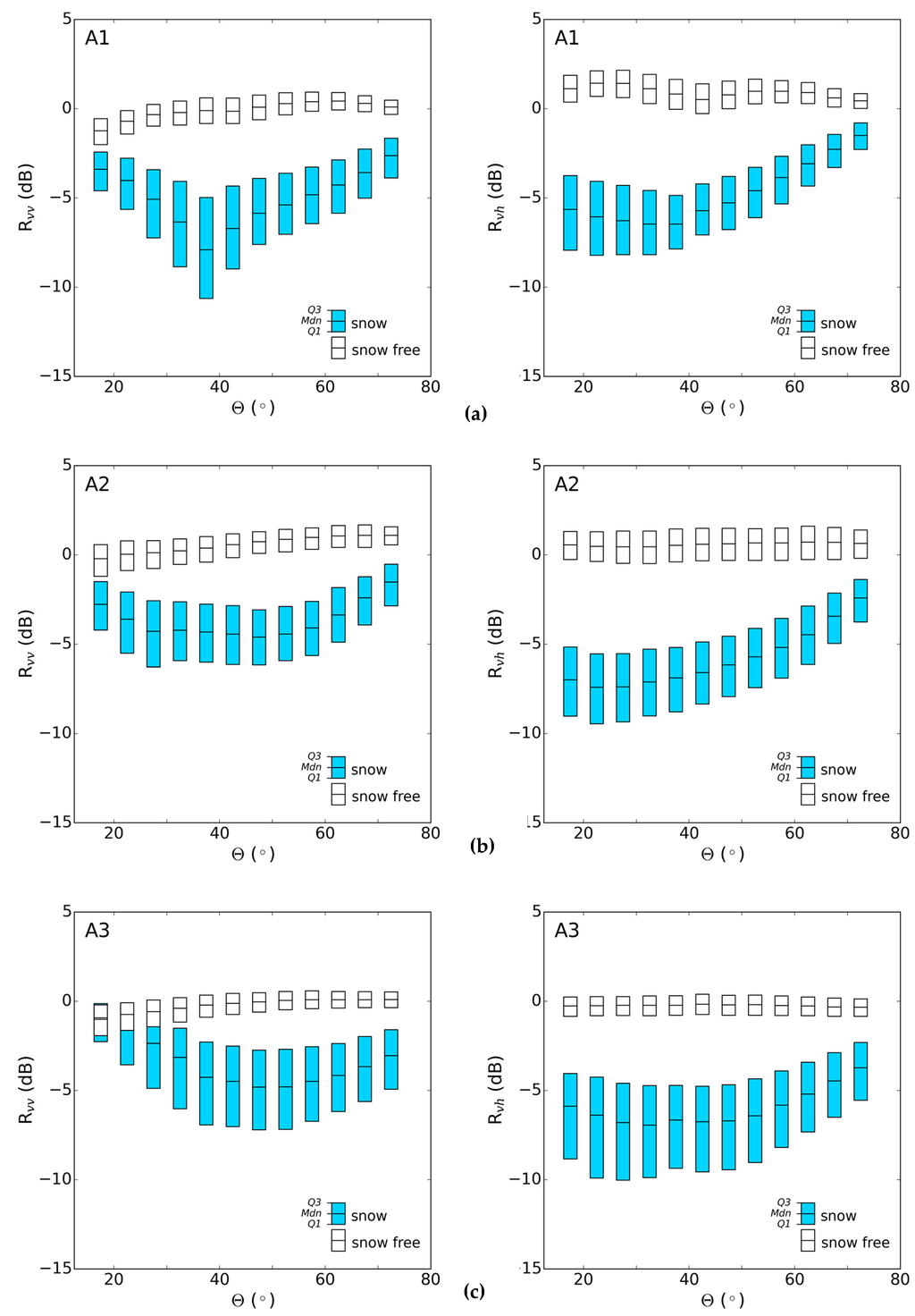 Backscatter ratio (median, Mdn, 1st and 3rd quartile) for S1 VV- and VH- polarized channels in dependence of the local incidence angle, , for areas classified as snow-free and snow-covered in Landsat images (see Section 3.2): (a) test site A1: Tröllaskagi; (b) test site A2: Ötztal Alps; (c) test site A3: Swiss Alps.