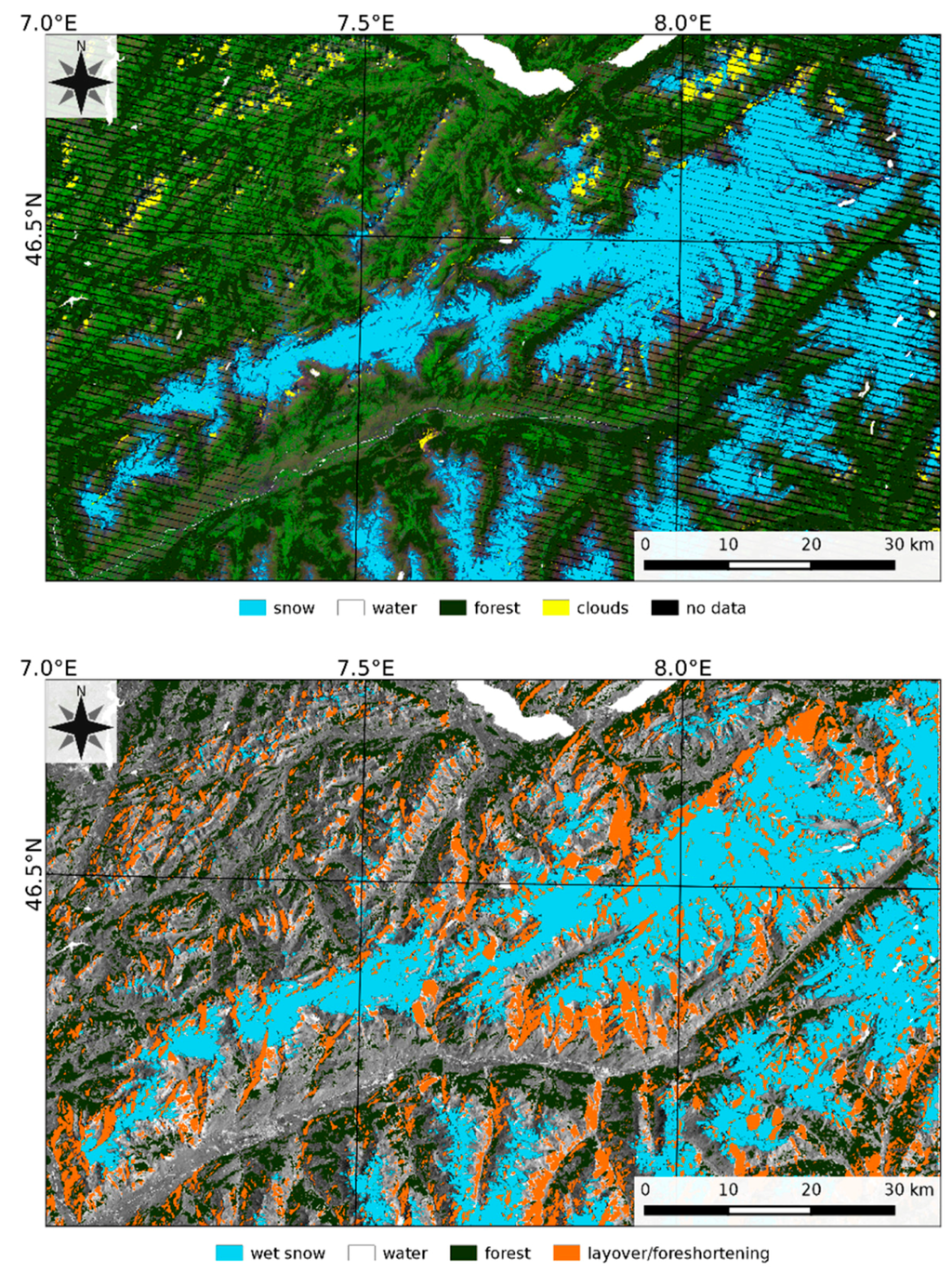 Snow map of Swiss Alps (Berne, Valais). (Top) Snow extent (blue) derived from Landsat-7 image of 3 June 2015; background: Landsat ETM+ bands 5, 4, 3; yellow: clouds; white: water. (Bottom) Snow extent (blue) derived from Sentinel-1 image of 7 June 2015; background: amplitude image, VV-channel; orange: mask for layover and foreshortening.