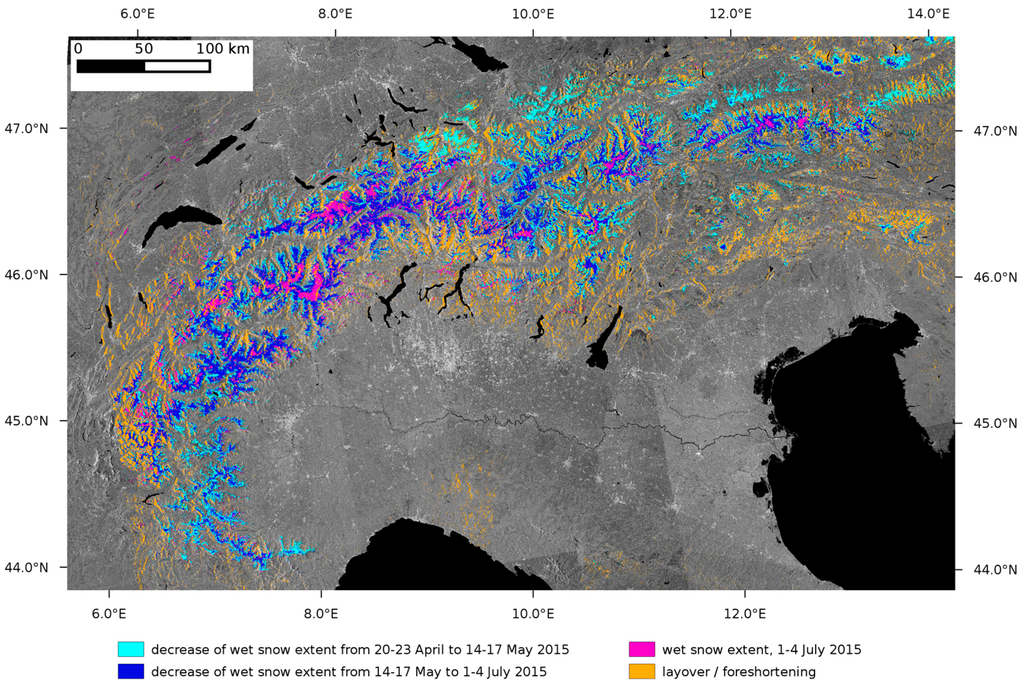 Map of snowmelt area extent over the Alps, derived from Sentinel-1 data of 20 to 23 April 2015 (Date 1), 14 to 17 May 2015 (Date 2), 1 to 4 July 2015 (Date 3). Light blue: decrease of snow extent between Date 1 and Date 2. Dark blue: decrease of snow extent between Date 2 and Date 3; Purple: snowmelt area on Date 3. Black: water surfaces; orange: mask of layover and foreshortening. Background: S1 SAR amplitude image, VV polarizations.